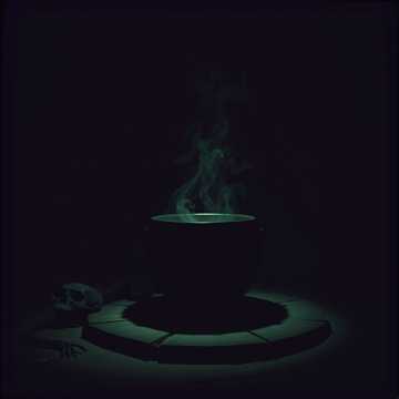 Create a looping ambient track for a quiet, dim dungeon room where a cursed undead fortune-teller sits beside a cold cauldron, Use soft, low ambient drones with a gentle, pulsing undercurrent—like slow breath or faint heartbeat, Add light bubbling or oozing sounds to represent the congealed sludge in the cauldron, Include distant, dusty paper sounds or dry bones shifting as the ghoul moves, Occasionally layer in soft whispering or muttered tones—nonverbal, unintelligible, and echoing with reverb, Add faint harmonic shimmer or magical resonance to suggest hidden knowledge and lingering magic, Keep all sounds restrained and eerie, No melody, rhythm, or vocals, The mood should be intimate, still, and slightly dreadful—like having your fate read by something that’s already dead, Target loop length: 3–4 minutes, seamless