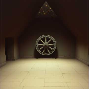 Create a looping ambient track for a large, silent stone chamber with a massive, unmoving wheel and faintly glowing constellations on the ceiling, Use soft, low drones from synth or bowed strings, layered with occasional quiet harmonic tones, like slow-tuned wind chimes or crystal bowls, Add subtle ambient crackling or static, as if from old magic or faint stellar energy, Use a slow, steady pulse or hum in the background, not rhythmic, but gently cycling like distant machinery asleep, No percussion, melody, or rhythm, Avoid tension or horror—this should feel ancient, heavy, and waiting, Include long, decaying echoes to evoke vastness, Emphasize a sense of stillness, mystery, and quiet potential, No voices, no sudden sounds, The music should sound like a forgotten mechanism, dormant for centuries, Target loop length: 4–5 minutes, seamless