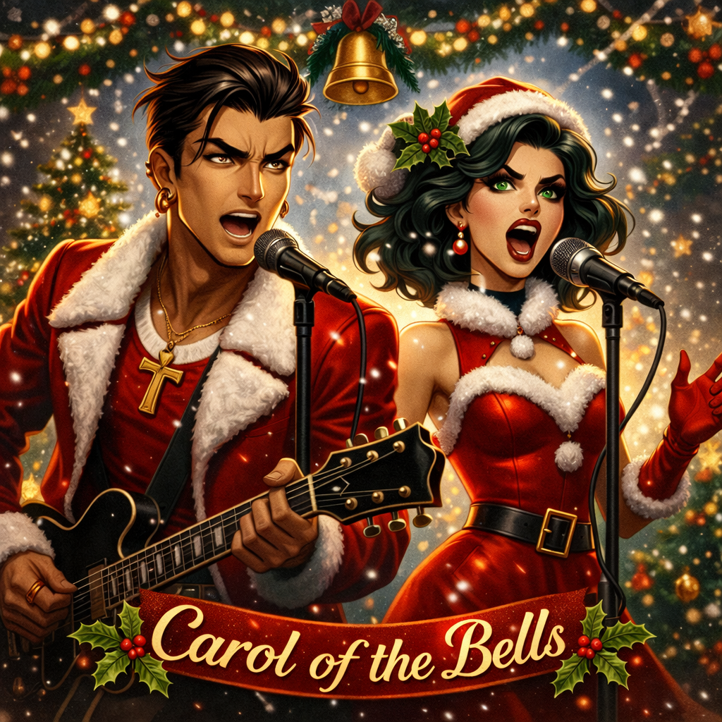Crisp instrumentation, Crisp vocals, High quality and high fidelity studio production, Wild and erratic propulsive tempo, Avant garde Christmas carol, Gregorian choir, Syncopated post punk revival, New Wave, Electronic and chopped syncopated percussion, Trumpets, layered angular guitars, electropop, Christmas song, christmas bells, 6 point harmony, Main male Post punk revival vocals are chopped, erratic, ironic and highly dynamic, uplifting, Anthemic choruses, wild and rambling tempo, Noise reduction, Crisp Sound quality, Climactic and epic final chorus