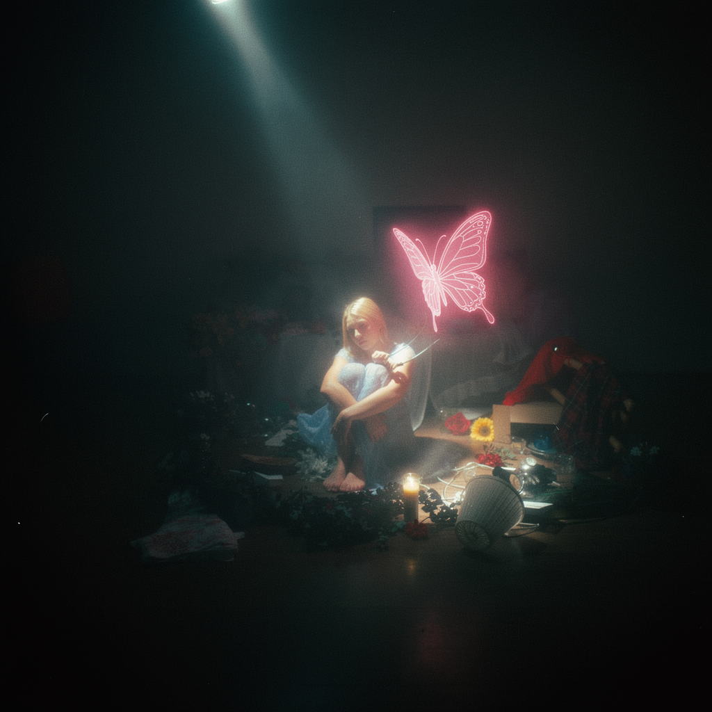 The slow acoustic emo ballad opens with intimate finger-picked guitar and breathy soprano vocals, supported by sparse keys and understated bass, Gentle drums and expressive cello join for atmospheric verses, The chorus blooms with layered harmonies, deep reverb, and wider instrumentation, subtly blending melodic emo, metalcore, thall, and alt metal textures, yielding a refined, immersive mix with gradual dynamic growth, all maintaining a calm, study-friendly feel