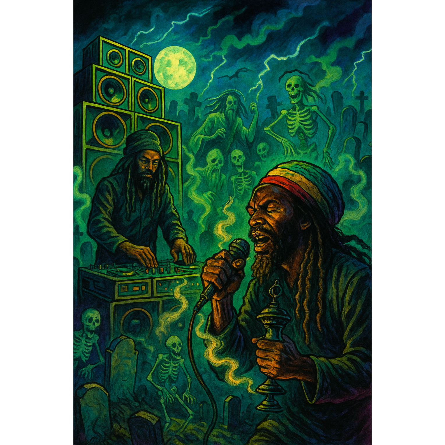Dark ragga dub with deep continuous sub-bass, heavy four-on-the-floor kick, crisp hi-hats, and tight snare, Include horns, brass section, and melodica riffs, Keep the bassline steady and rolling, Minimal but powerful layers: haunted organ, melodica, and subtle synth textures, Add dub effects — delay, echo, reverb — used rhythmically, not chaotically, Tempo around 142 BPM, hypnotic and heavy, Male vocals in a dark Jamaican digital dub style — deep, smoky patois voice, spiritual and slightly menacing, Mood: dark, cinematic, mystical, and heavy, like a sound-system ritual in a graveyard, Avoid dubstep or EDM sounds — keep it roots-based and dubwise, not club-style