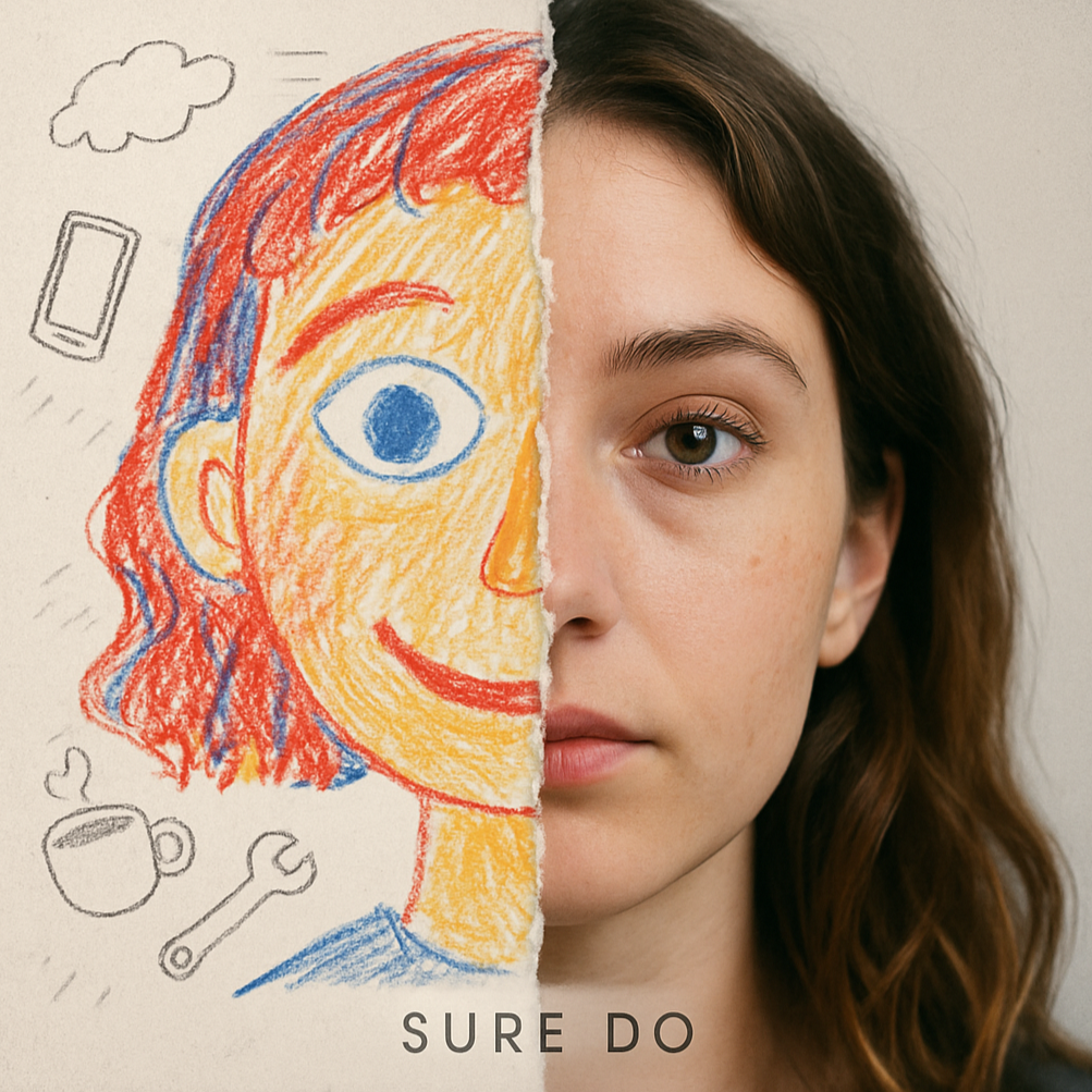 Genre: alt-pop / experimental indie with lo-fi and electro-grunge textures, Tempo: 84 BPM, swung 16ths, relaxed groove, Instrumentation: detuned synth pads, chorus guitar, fuzzy bass, lazy drums with rim clicks and sub kick, ambient vocal layers, Mood: sardonic, self-aware, melancholic but resilient, Vocal approach: conversational delivery with alternating half-spoken and melodic phrases; layered harmonies and occasional whispered doubles, Production references (conceptually): combine organic instruments with processed digital grit, Mixing: midrange-forward vocals, compressed drum bus, analog warmth, Mastering: moderate loudness, preserve dynamic swells, final fade with reverb tail extending several seconds
