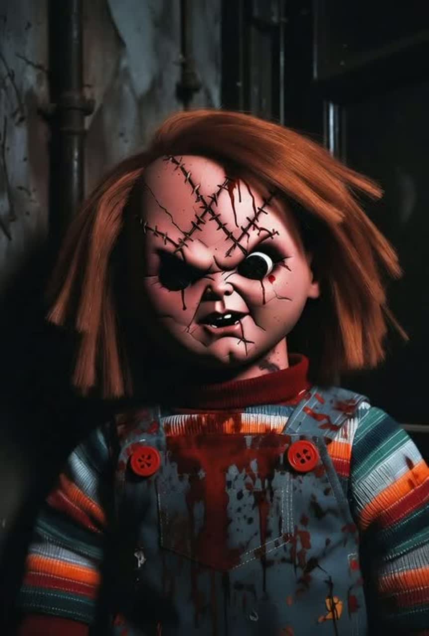 Dark horror-rock with a playful edge, inspired by *Chucky*, Distorted guitars with staccato, bouncy riffs create a sinister yet mischievous energy, Percussion is punchy and rhythmic, alternating between fast chase-like beats and slow, suspenseful builds, Bass is driving and gritty, grounding the chaos, Vocals are theatrical: deep, tense growls for menace, switching to sarcastic or taunting tones for dark humor, Occasional high-pitched or whispered lines evoke the doll’s small, creepy presence, Synths and sound effects (toy springs, creaks, laughter, metallic twangs) punctuate the arrangement, enhancing the playful horror, Dynamic shifts between chaotic bursts and eerie calm heighten tension, The overall mood is simultaneously scary, whimsical, and cinematic, balancing terror and dark fun in a horror-rock framework