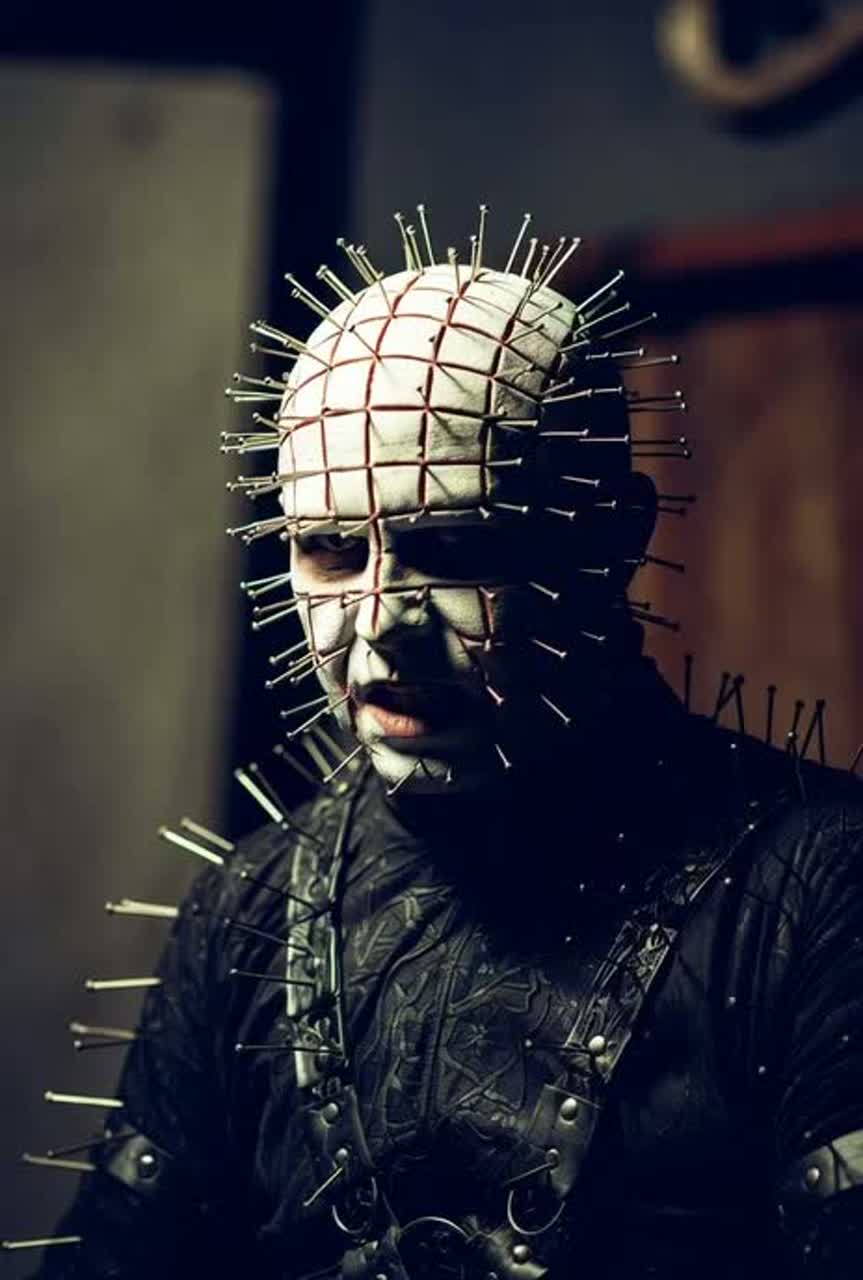 A dark, gothic-industrial horror-rock style built to evoke the nightmarish, erotic, and sadomasochistic atmosphere of Hellraiser, Distorted guitars and low-end synths layer with slow, deliberate percussion that clangs like chains on stone, Reverb-drenched vocals alternate between whispered dread and soaring, tormented wails, emphasizing tension and despair, Atmosphere is paramount: cavernous echoes, metallic screeches, and eerie drones make every note feel like the walls themselves are alive, Moments of dissonance punctuate the rhythm, reflecting the chaos of pain and pleasure, Layered textures—feedback, organ tones, and subtle industrial percussion—create claustrophobic, suspenseful passages, The overall effect is hypnotic, brutal, and ritualistic, immersing the listener in a world of flesh, desire, and eternal torment