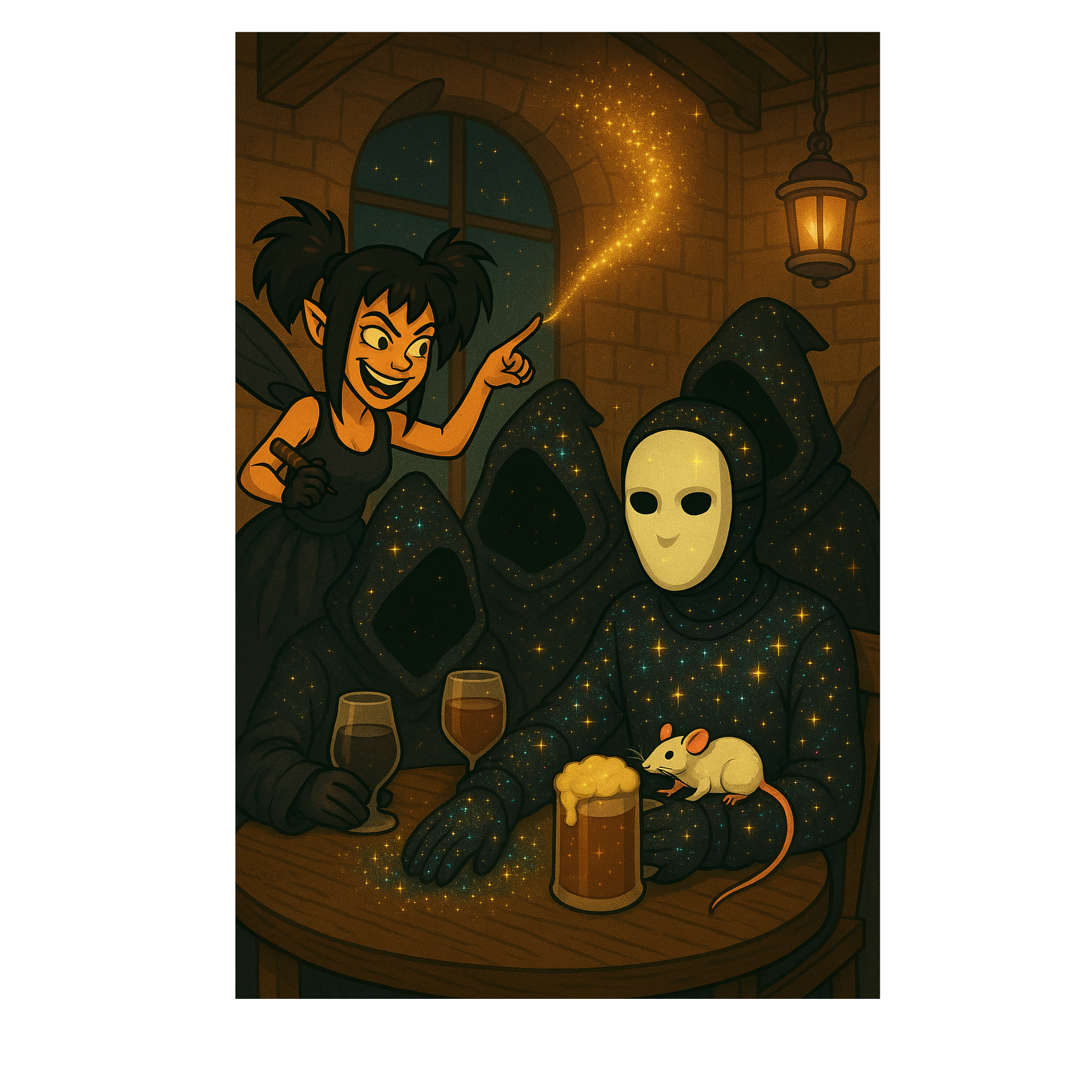 Spoken word narration mixed with comedic theater, Donjon, Cartoonish fantasy voices, each character exaggerated, Dialogue sung in a talky style, almost like voice acting, with dramatic pauses and silly emphasis, Funny, chaotic, like a parody of an epic quest, Over-the-top, playful, storytelling tone, Energetic, humorous, theatrical