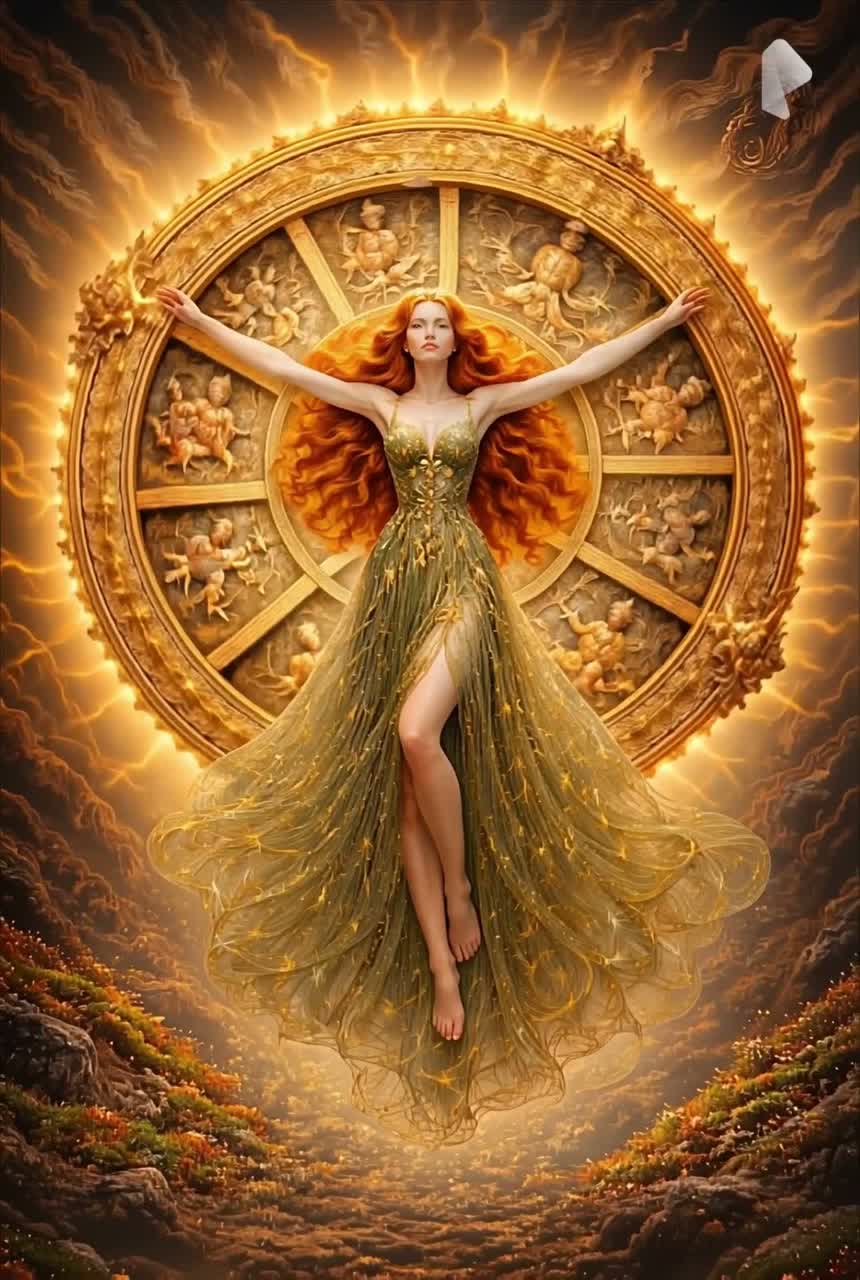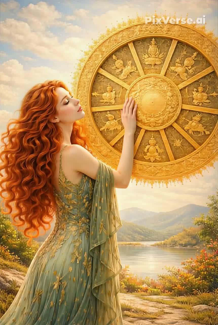 Epic ritual operatic aria merging late-Puccini verismo with cinematic heroic expansion, Slow circular adagio that gradually gains upward momentum, Velvety deep female soprano with emotional warmth and luminous strength, Lush symphonic strings, shimmering piano, warm cascading brass, ethereal theremin accents, floating violins and rotating timpani pulses suggesting an eternal wheel in motion, Mixed SATB choir evolves from distant sacred chanting into radiant heroic declarations, Harmonic movement cyclical but progressively opening into brighter tonal colors, Mood transcendent yet joyful, ritualistic yet fresh, expressing liberation through movement rather than stillness, Cinematic sacred grandeur with luminous spacious depth