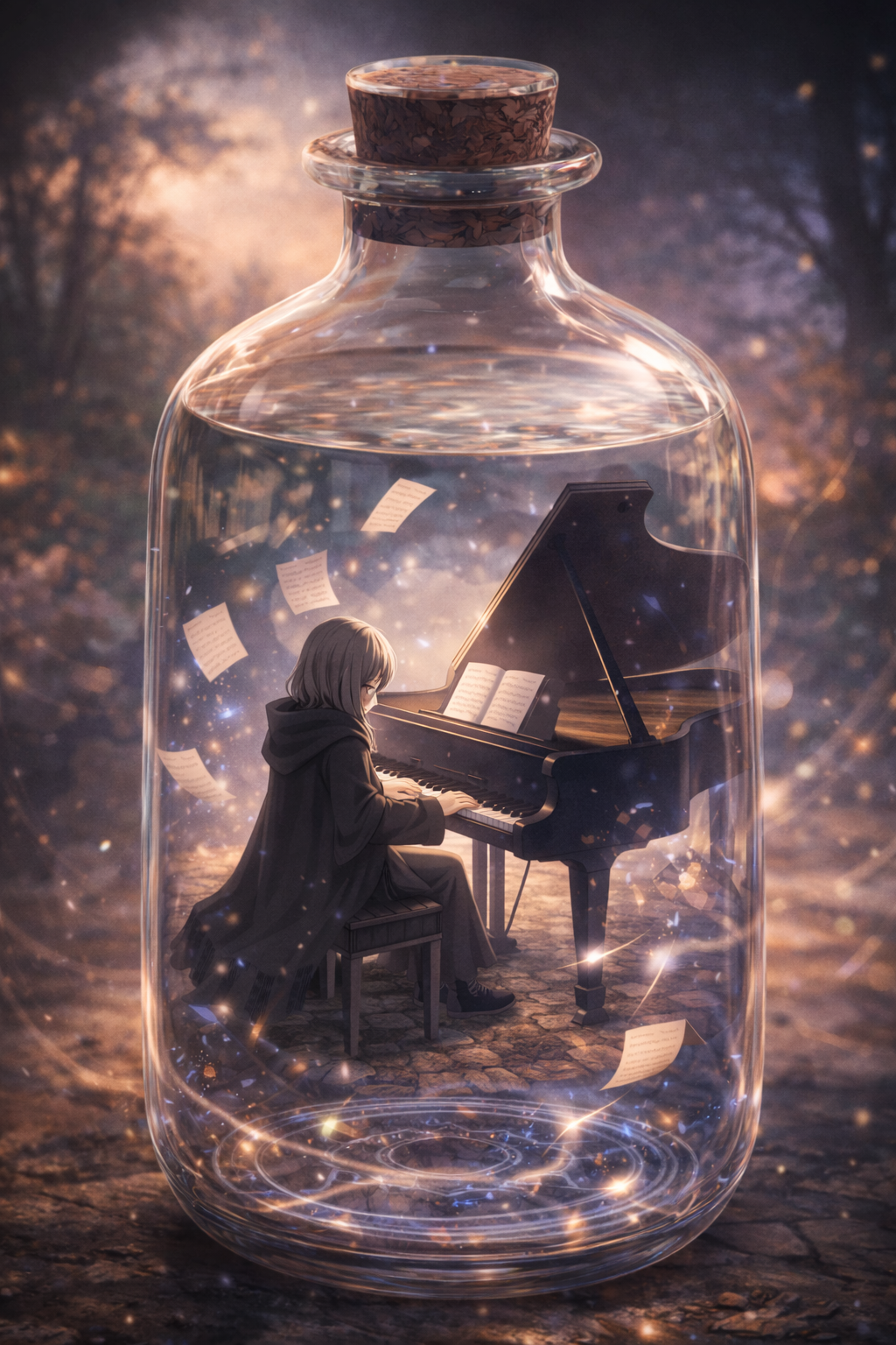 Fusion of classical piano, strings, and gentle synth layers, Starts in minor key with nostalgic emotion, gradually transitions to major with hopeful tone, Symbolizes archiving memories and finding peace