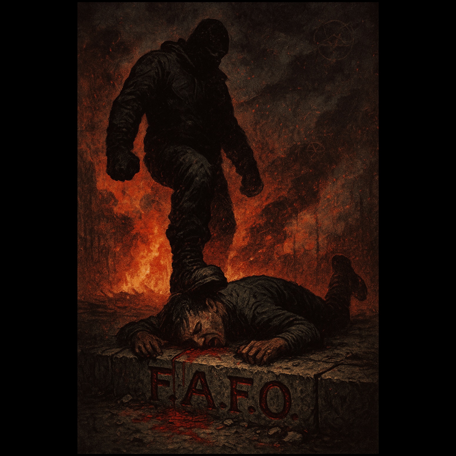 Aggressive metalcore with hardcore and death metal elements, Screamed vocals, fast rap verse, and brutal breakdowns, Heavy distorted guitars, double-kick drums, and a blistering solo, Raw, gritty, unpolished production with dynamic flow changes and tempo shifts, Themes of vengeance, humiliation, and violent retribution, Harsh, rhythmic vocal delivery with rap-metal crossover energy, Includes a mid-song flow switch to double-time rap, Chorus features gang vocals, Breakdown is guttural and punishing, Final chorus hits at double tempo for a chaotic, high-impact finish, Inspired by modern rap-metal hybrids and intense live show energy
