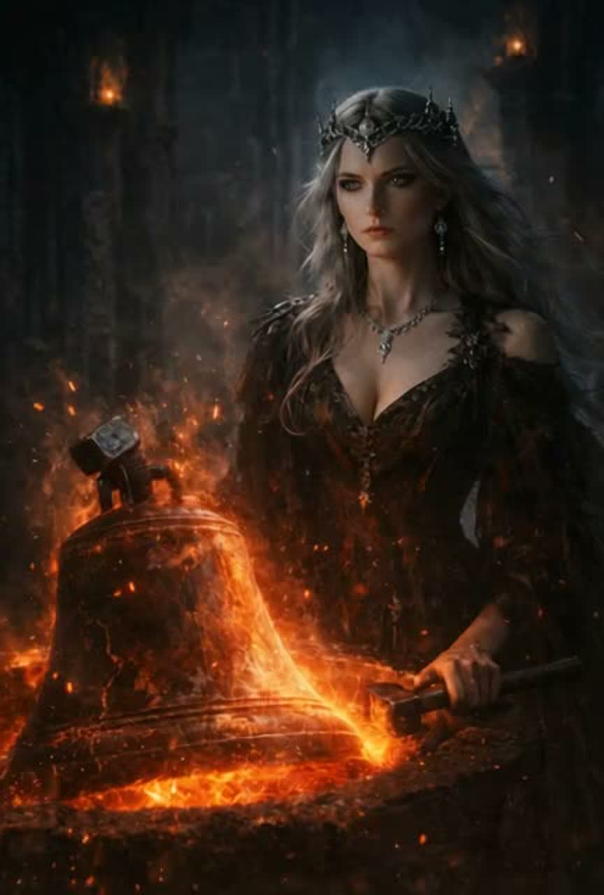Dark Ritual Folk × Cinematic Sacred × Gothic Ambient, 80–90 BPM, Female lead vocal: emotional, warm, powerful, slightly mystical, Optional low male choir in background for depth, Atmosphere: ancient forge, fire, echoes, time passing, Instruments: deep drums, anvil hits, low strings, choir pads, bell tones, subtle piano, ambient textures, Structure: Intro (forge + bell), Verse calm, Pre build, Chorus epic, Verse darker, Pre tension, Chorus bigger, Bridge ritual spoken/whisper, Final Chorus powerful, Outro fading bell, Theme: life cycles, creation, destruction, memory, time, human struggle, Organic cinematic mix, wide stereo, no EDM, no pop, no autotune, emotional climax