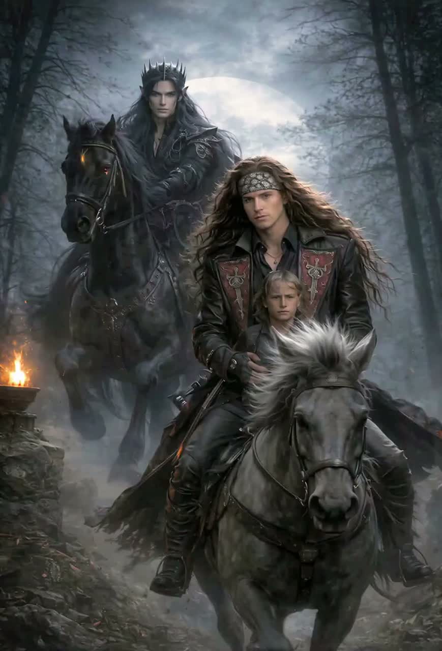 Slavic Metal, Dark Pagan Metal, The Witcher elements, Dark ritualistic Slavic Music, Vocals should be Male male, deep, controlled, slightly rough tells the story with tension in The Style Of Sebastian Bach, Erlkönig Male deep beautiful Male Voice: soft, seductive, whisper-like, slightly eerie, almost calm, Lead Guitar sharp, aggressive, melodic leads in The Style Of Dave Sabo, Rhythm Guitar tight, fast, slightly distorted, palm-muted patterns in The Style Of Izzy Stradlin, Bass deep, dark, following the rhythm closely in The Style Of Nikki Sixx, Drums fast kick pattern galloping feel, strong snare, tom fills for tension, occasional double kick in chorus in The Style Of Tommy Lee, low drone instruments ambient textures, Cello tremolo for tension, dark pads, rhythmic pulse that feels like horse riding through the night, Mood & Theme : dark, haunting, relentless, tension, fear, psychological horror, Erlkönig as a whispering force