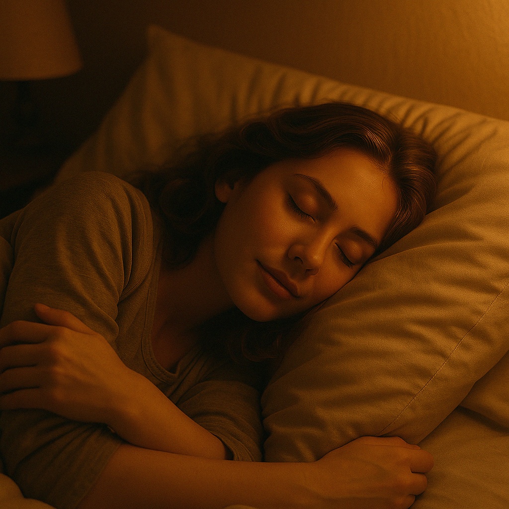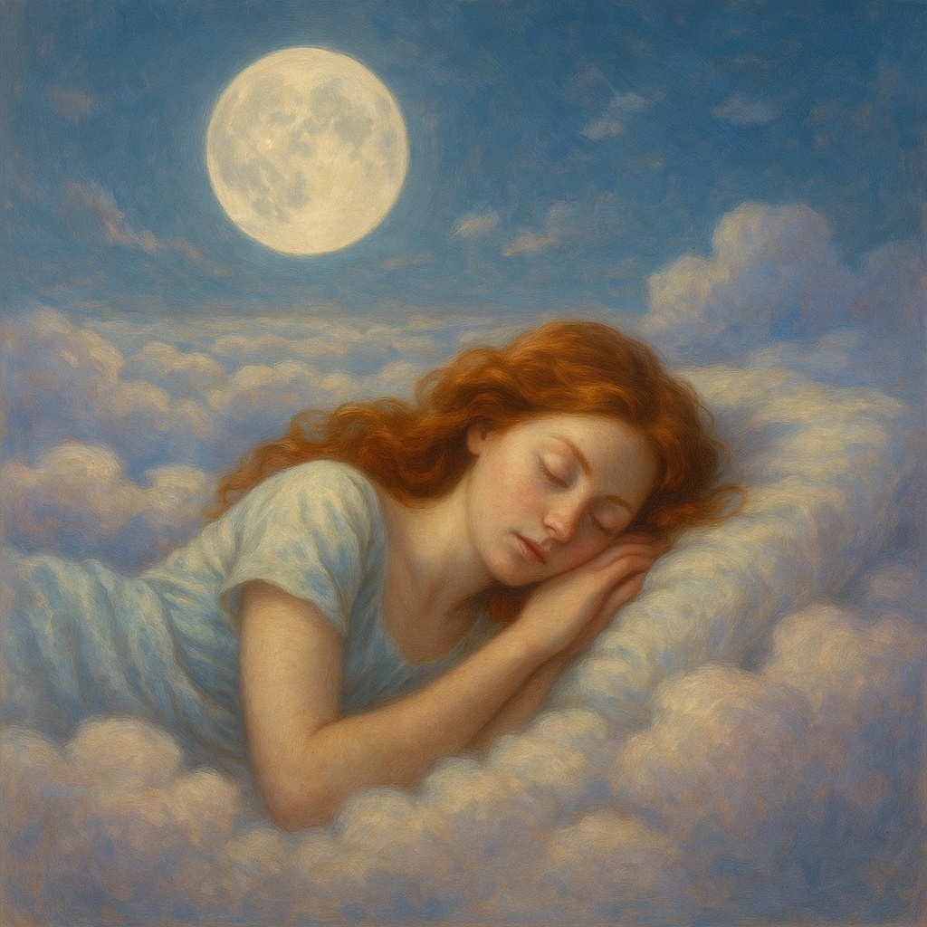 Dreamy adult bedtime song, young woman's voice (lullaby style), very slow tempo (60 BPM), fingerstyle guitar, ambient electric piano, subtle strings, delicate chimes, smooth and repetitive melody, soothing nighttime mood