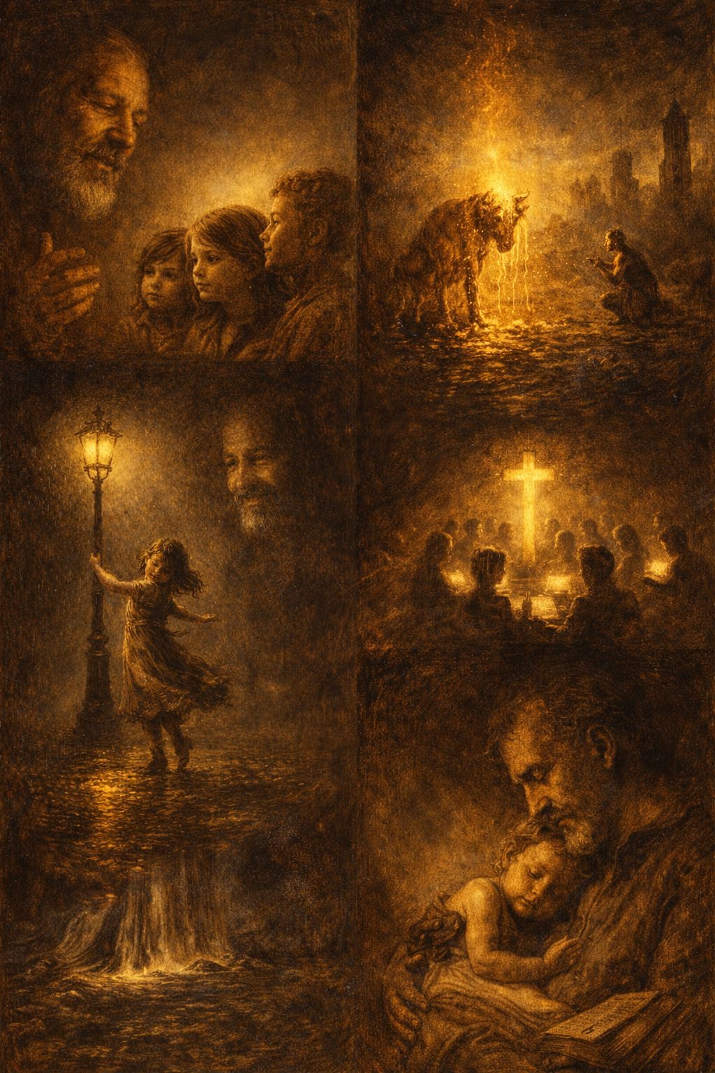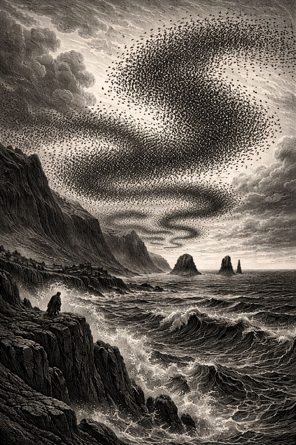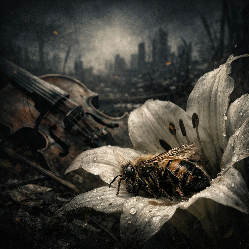 2 min 25 sec cinematic score à la Ennio Morricon e: starts with lonely whistle motif in D minor, adds wordless female choir, sparse strings pizz, then brass & timpani swell for a single seismic burst, church organ & boy choir counter‑theme, ending on intimate harmonica over distant wind, Wide dynamics, analog feel, no electronic pads