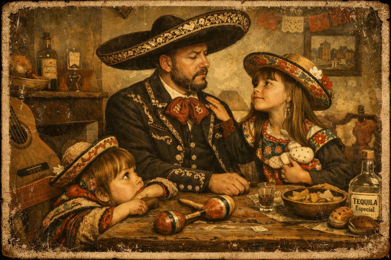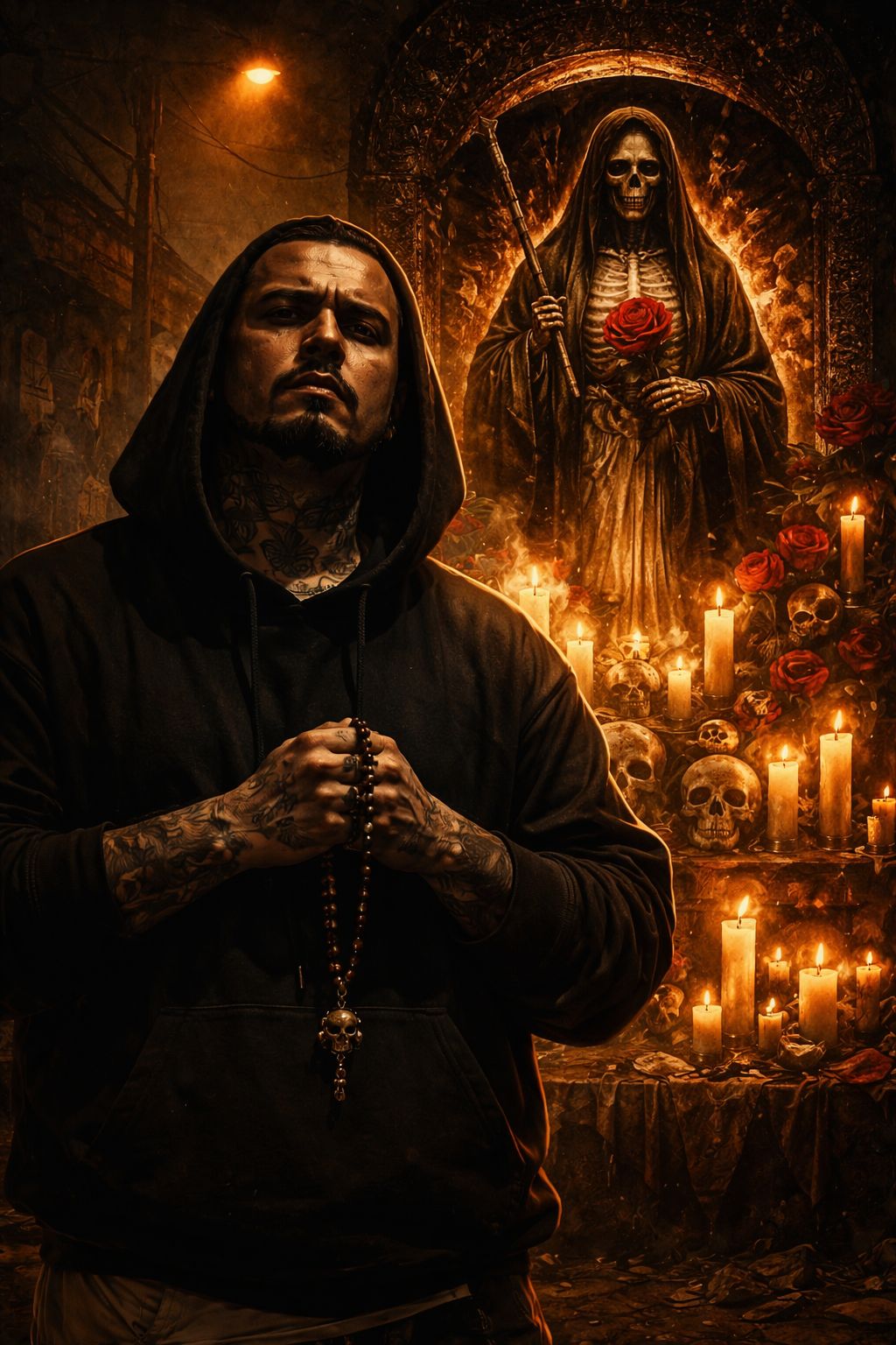 Dark latin hip hop instrumental, mystical barrio energy, underground Mexican rap fusion, nocturnal cinematic vibe, Tempo 92 BPM, key D minor, Heavy boom bap drums, deep sub bass, hypnotic Spanish guitar riff, subtle distorted electric guitar, low brass stabs, light norteño accordion texture, tribal tom accents, vinyl crackle, low ambient drone, Structure: intro guitar + drone, drop boom bap + bass, section energy rise with brass & guitar distortion, breakdown with drone + accordion, final drop full instrumentation, ends abruptly, Keep raw & underground, no trap hi-hats, no pop synths, organic dusty textures, Imagine midnight ritual under border town lights, La Flaca presence, mystical, ceremonial, cinematic