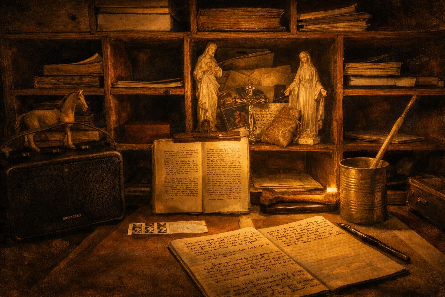 storytelling song with gregorian ambient, atmosphère délicate, confidences de deux amis, retrouvailles, orchestre enregistrement Radio France 1950, studio, mono, voix d'homme vielli, abattu, qui s'accroche à un espoir
