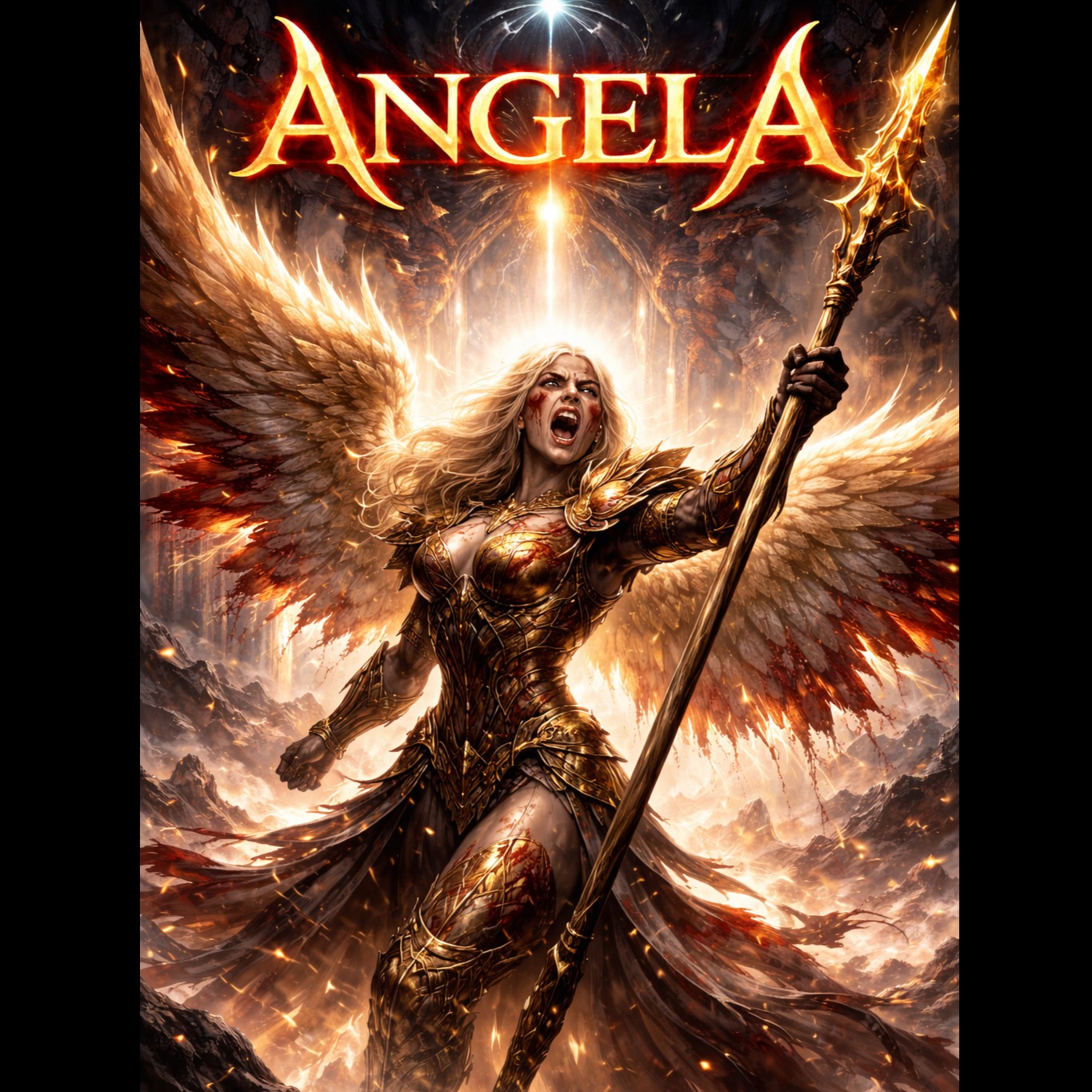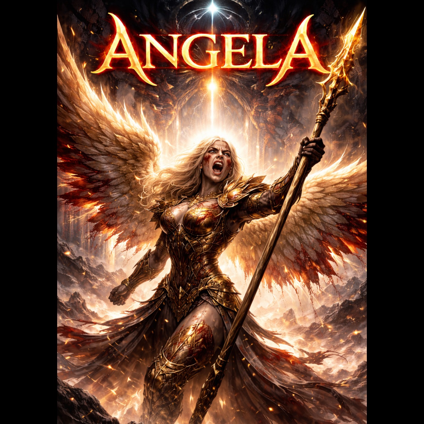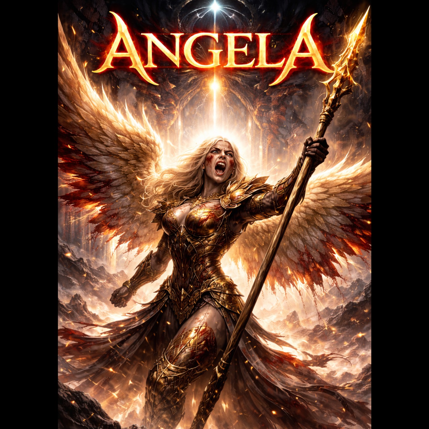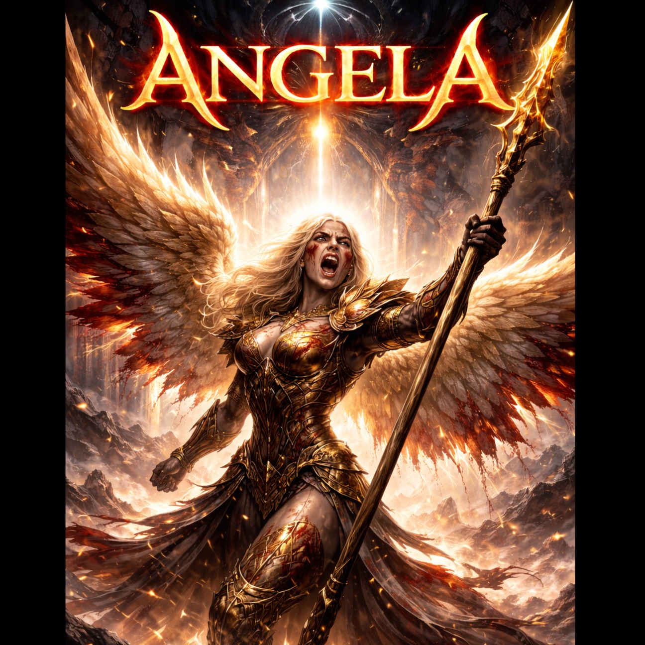 The song begins softly with glass harmonica, duduk, low ambient pads, and distant female humming, A maternal female voice speaks gently but powerfully, filled with love, strength, and urgency, Gradually introduce cathedral organ, layered choir, and deep cinematic drums, As the track progresses, add heavy drop-tuned guitars and dramatic percussion, Include choral chanting and humming throughout, The hook features a powerful repeated vocal line: “Angela… Angela… My dear Angela… The devil has awakened… Angela… wake up, ”