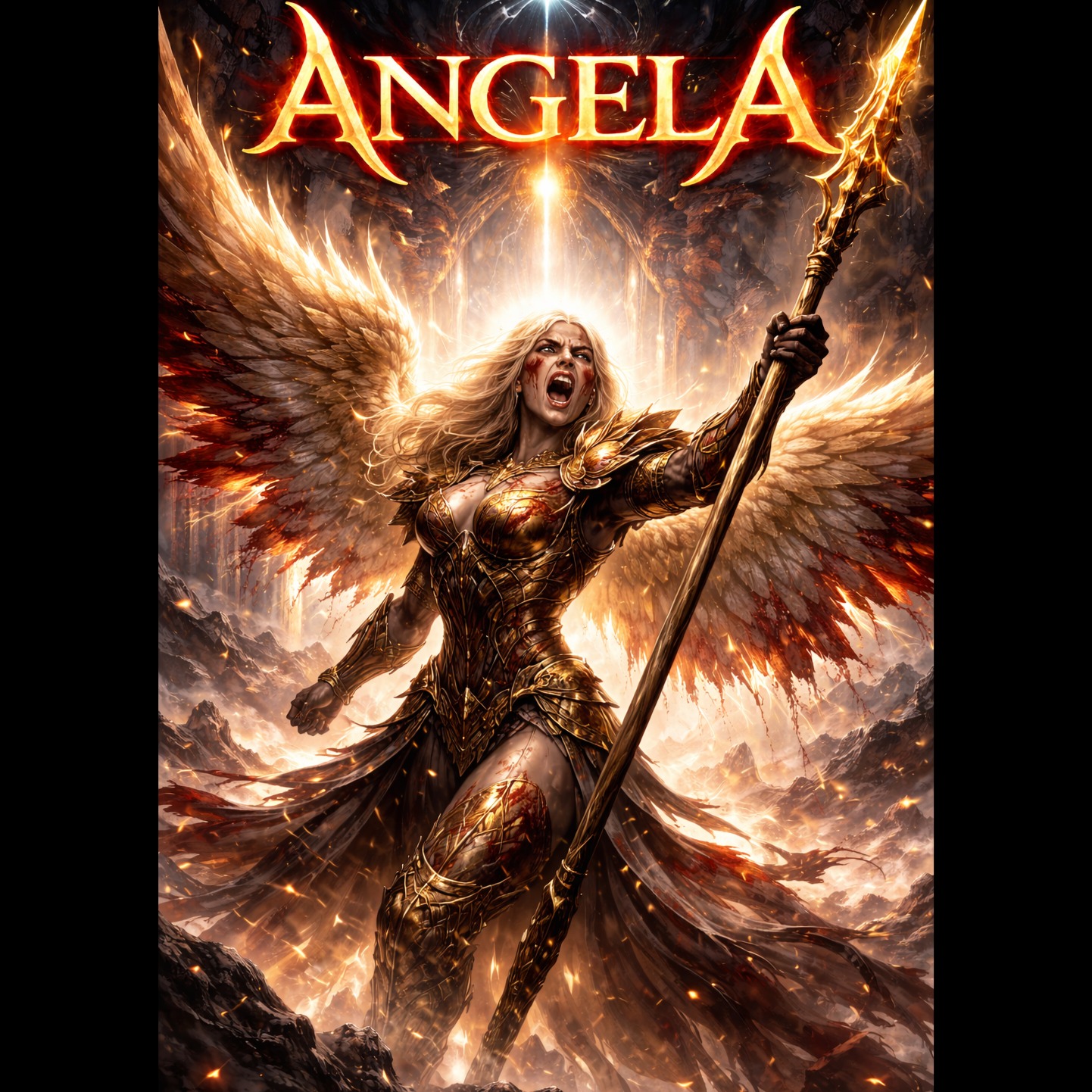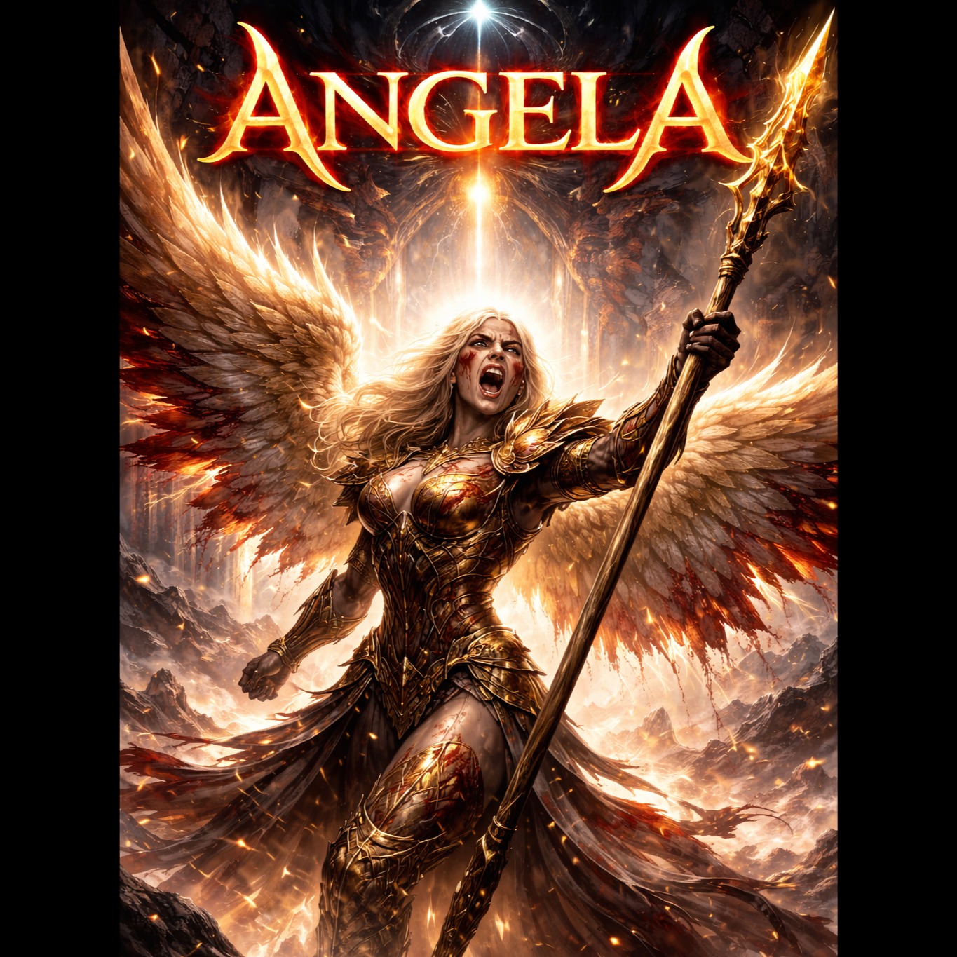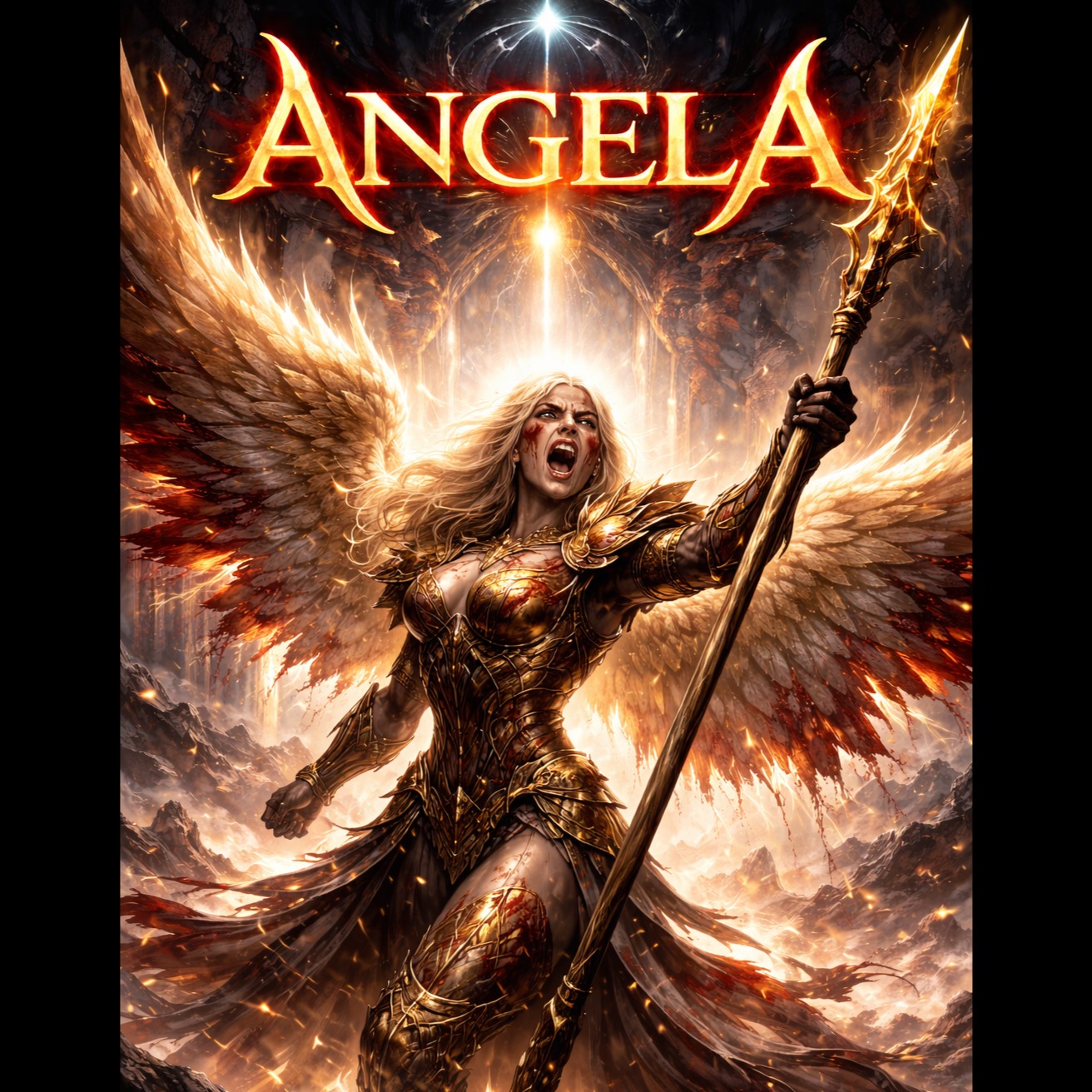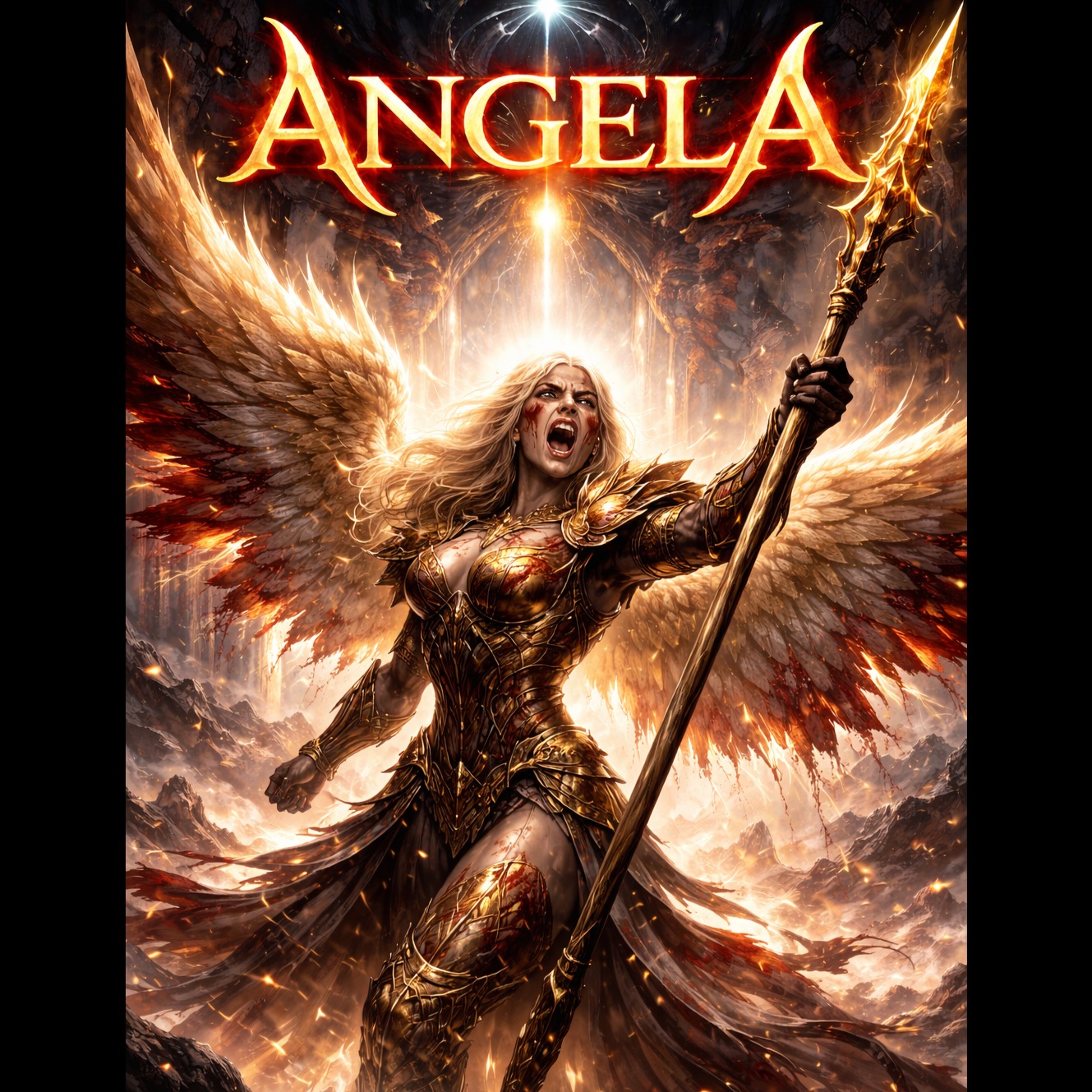 The song begins softly with glass harmonica, duduk, low ambient pads, and distant female humming, A maternal female voice speaks gently but powerfully, filled with love, strength, and urgency, Gradually introduce cathedral organ, layered choir, and deep cinematic drums, As the track progresses, add heavy drop-tuned guitars and dramatic percussion, Include choral chanting and humming throughout, The hook features a powerful repeated vocal line: “Angela… Angela… My dear Angela… The devil has awakened… Angela… wake up, ”