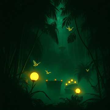 Create a dark wonky, mid-tempo psychedelic breakbeat bass track (85 BPM), Build around rubbery, elastic wobble bass, warped LFO bends, stumbling neuro patterns, and unpredictable swing, Add organic jungle and nature sounds—birds calling, tropical insects, rustling leaves, distant monkey chatter—woven rhythmically into percussion and transitions, Include Flowdan -influenced vocals: short toasts, melodic chants, filtered phrases processed with dub delay and dark fuzzy echo, Sound design should feel alien yet natural: gooey squelches, chirps, resonant drips, glitch pops, underwater swampy whomps, and psychedelic swells, Drops hit with cartoonishly bending basslines, sub punches, and slippery syncopation, Atmosphere should feel like a dark grungy jungle ritual, humid, primal, and alive, with massive festival-grade energy and clean punchy drums