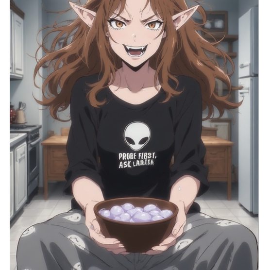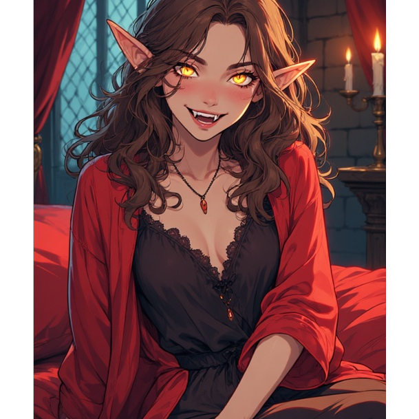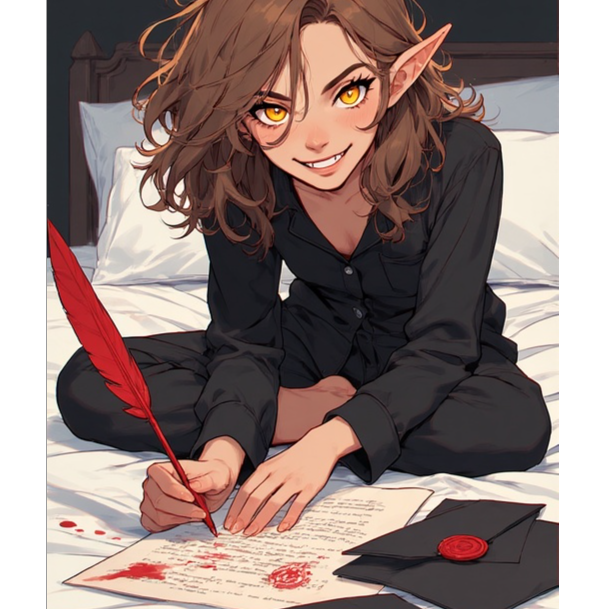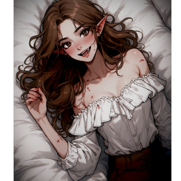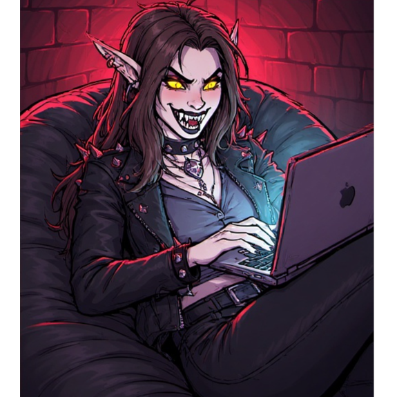 sarcastic female vocals, pop punk, grunge, sassy, playful, catchy, unapologetic, comedic, dark humour, angst, suave yet dark, vampire