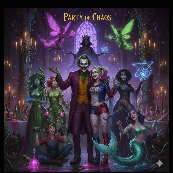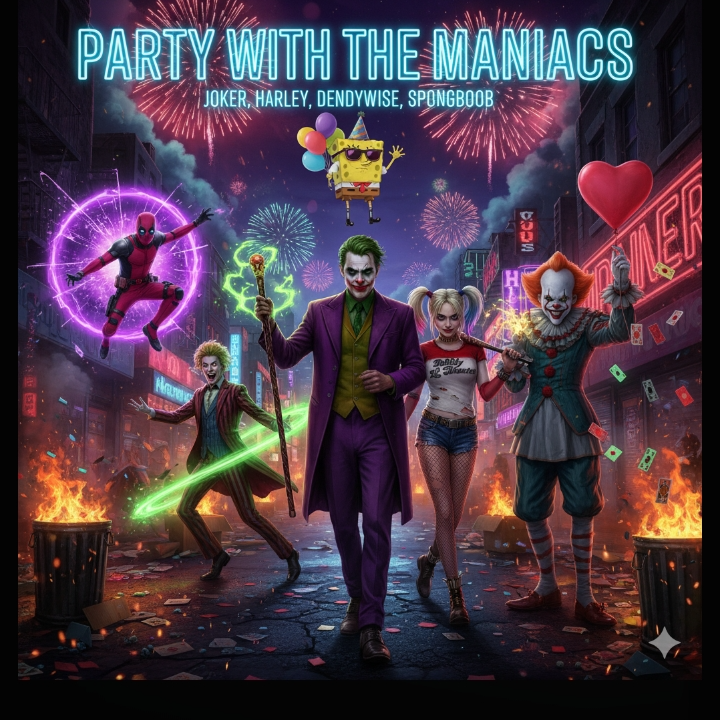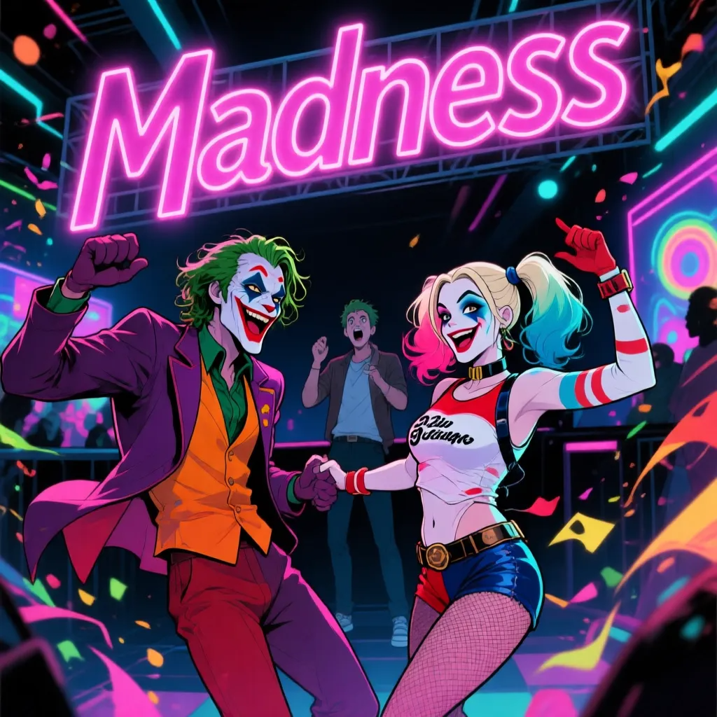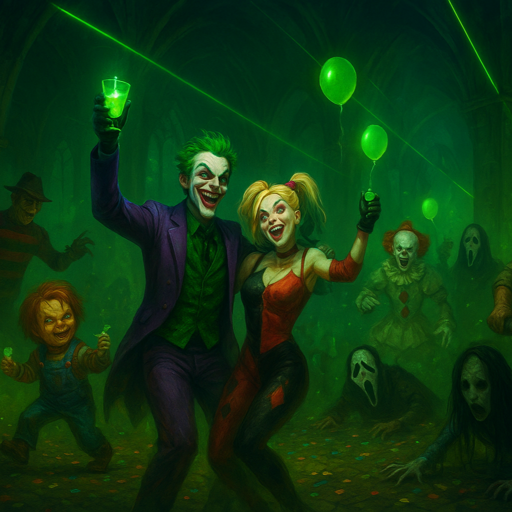 > Style: high-energy rave, electronic dance, Halloween party vibe, manic tempo, heavy kick drums, distorted synths, cartoonish FX, fast melodic whistles, comic sound effects, layers of spooky laughter, chaotic party atmosphere, bouncing bass, chopped vocal drops, call-and-response leads, big club build-ups and drops, sampled crowd noise, echoing funhouse elements, filtered transitions, playful glitches, echoes of retro game music, sudden comedic breaks, overall insane and danceable, No Auto-Tune, no aggressive trap hats, humorous and wild, Key: C Minor, BPM: 130, Vocals: Male voice only (Joker style) â theatrical, manic, chaotic, playful but dark, Lots of laughs, whistles, FX, spoken lines, exaggerated like a cartoon villain at a rave, FX: [laugh, male, dark, sinister], [laugh, male, loud, chaotic], [whistle, fast, melodic], [crowd cheer], [explosions, firework FX], [comic boing, cartoon FX], [funhouse echoes]