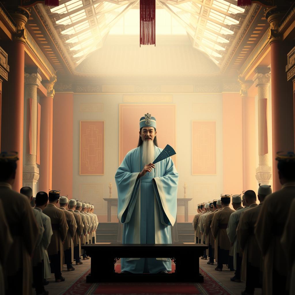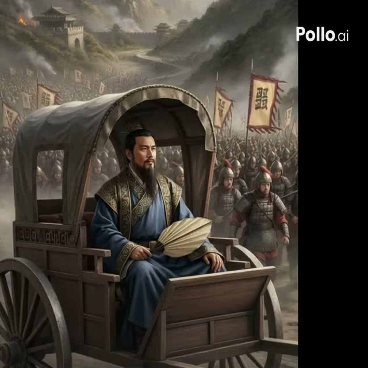 An epic fusion of traditional Chinese instrumentation and modern heavy metal, characterized by a high-energy tempo and dramatic shifts in intensity, The track opens with a virtuosic, fluttering guzheng solo utilizing rapid tremolo and glissando techniques, which is suddenly interrupted by a crushing, low-tuned electric guitar riff and aggressive drum fills, The main theme features a soaring, operatic male vocal performance in Mandarin, showcasing a powerful chest voice and wide vibrato, The instrumentation includes distorted electric guitars playing palm-muted rhythmic patterns, a driving bass guitar, and a full drum kit with prominent double-bass pedal work, Traditional elements like the guzheng and erhu are woven throughout, providing melodic counterpoints to the heavy metal foundation, The song structure follows a standard verse-chorus format but includes an extended instrumental bridge featuring a technical electric guitar solo with sweep picking and tapping, followed by a traditional string breakdown, The production is polished and cinematic, with a wide stereo field and heavy reverb on the vocals to enhance the grand, theatrical atmosphere