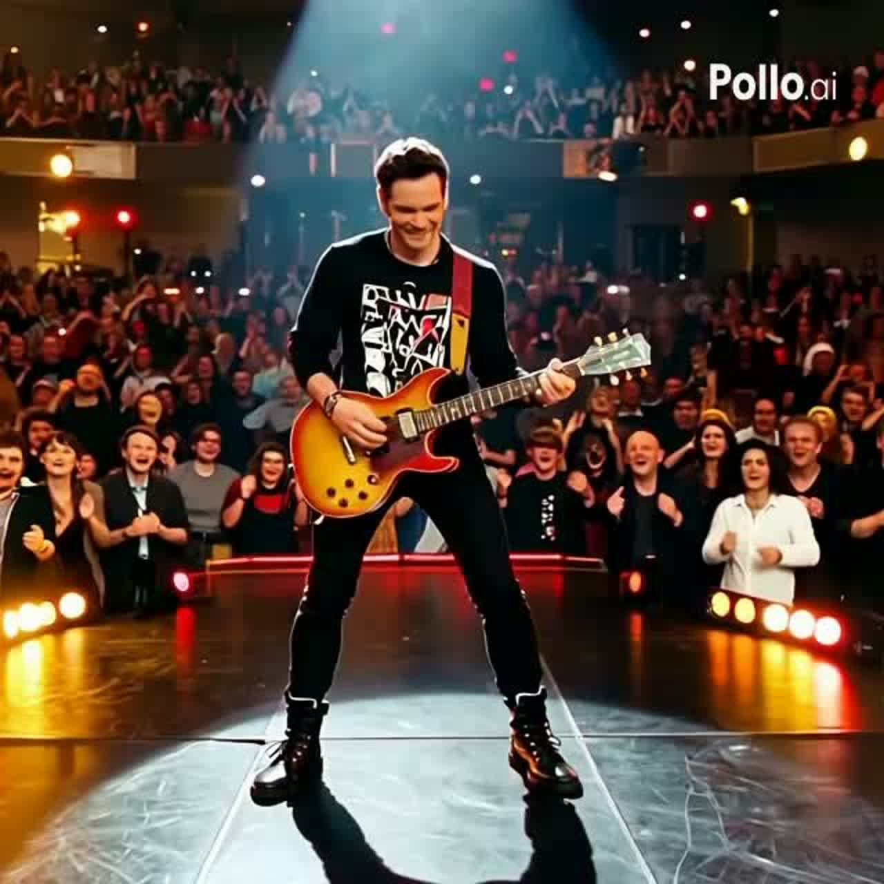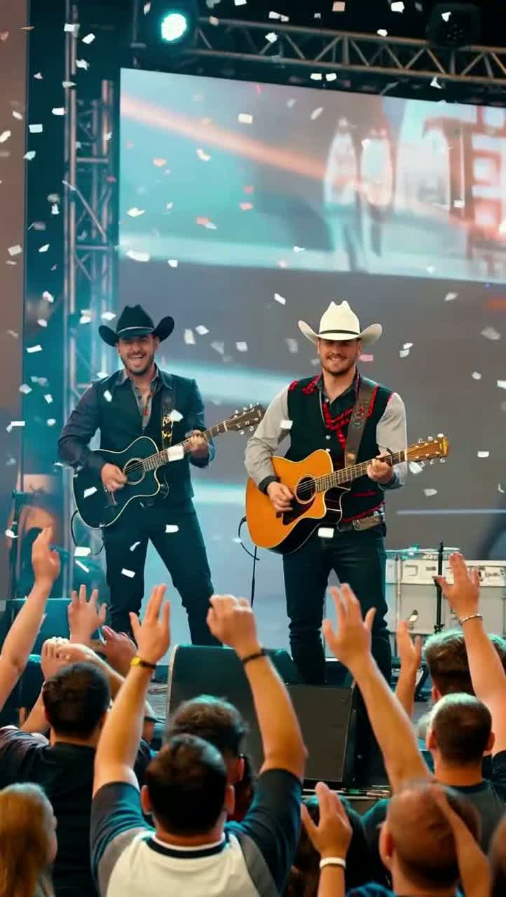 A grand live concert setting, with 500, 000 clapping and singing in unison, Lively strings—cello and violin—craft a splendid, luxurious orchestral bed, The tempo is brisk, A guitarist bursts in with a dazzling solo, igniting energetic crowd participation through foot-tapping and clapping, After the music peaks, the audience erupts in extended, thunderous applause and chanting, sustaining the vibrant atmosphere