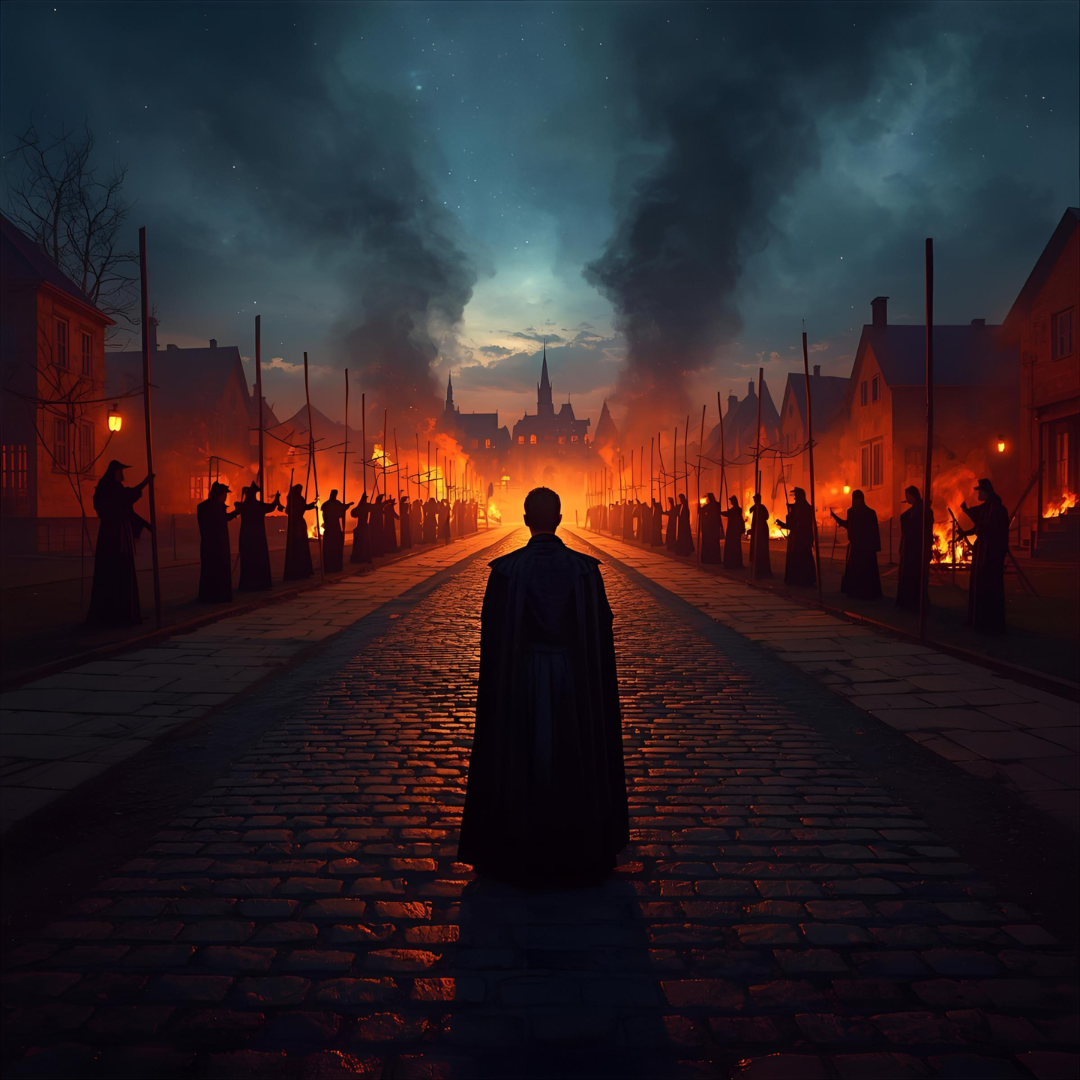 Dark gothic/industrial metal, intense and fanatical atmosphere, Male vocals (Angel), deep, authoritarian, preacher-like delivery, with gothic choirs in the background, Tempo ~105 BPM, dynamic range with sudden breakdown section, Instrumentation: distorted guitars, thunderous drums, organ, cinematic strings, haunting choirs, subtle industrial metallic echoes, Verses grim, sermon-like, narrating the inquisitor’s conviction, Choruses explosive and hymn-like, Breakdown: slow, heavy, chugging guitars, half-time drums, chants/gregorian style backing vocals emphasizing “Flames as justice, fire as truth, no mercy, no doubt, the sinners shall burn!” Outro solemn with organ and choirs fading, Theme: inquisitor convinced he delivers divine justice by burning witches, Length ~4:30
