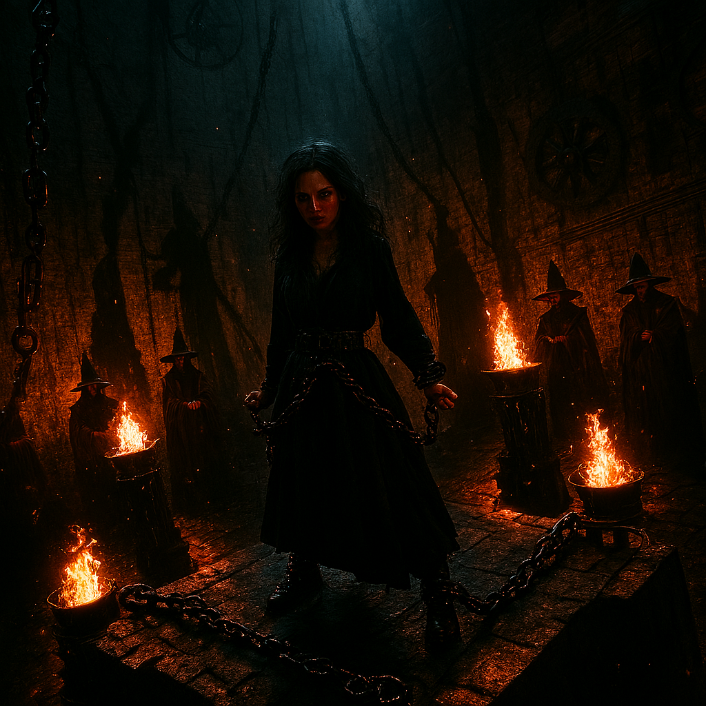 Gothic-industrial/metalcore track, dark, extremely aggressive, cinematic, Female vocals only (Adria), raw, powerful, expressive, intense, ethereal yet fierce, Tempo 105–120 BPM, Instrumentation: razor-sharp distorted guitars with tremolo picking, thunderous double-kick and blast drums, deep rumbling bass, cinematic strings, industrial synth layers, glitch effects, metallic echoes, occasional stutters and digital distortion, Verses tense, raw, atmospheric; choruses soaring, explosive, chaotic; bridge epic, full aggression, representing defiance and vengeance; outro fades with ghostly synths, choirs, industrial echoes, Theme: witch judged in 17th-century trials, injustice, fear, defiance, rising against inquisitors, unchained spirit, ~4:00 min