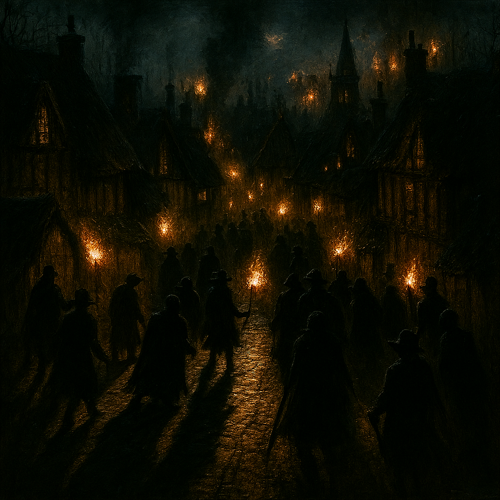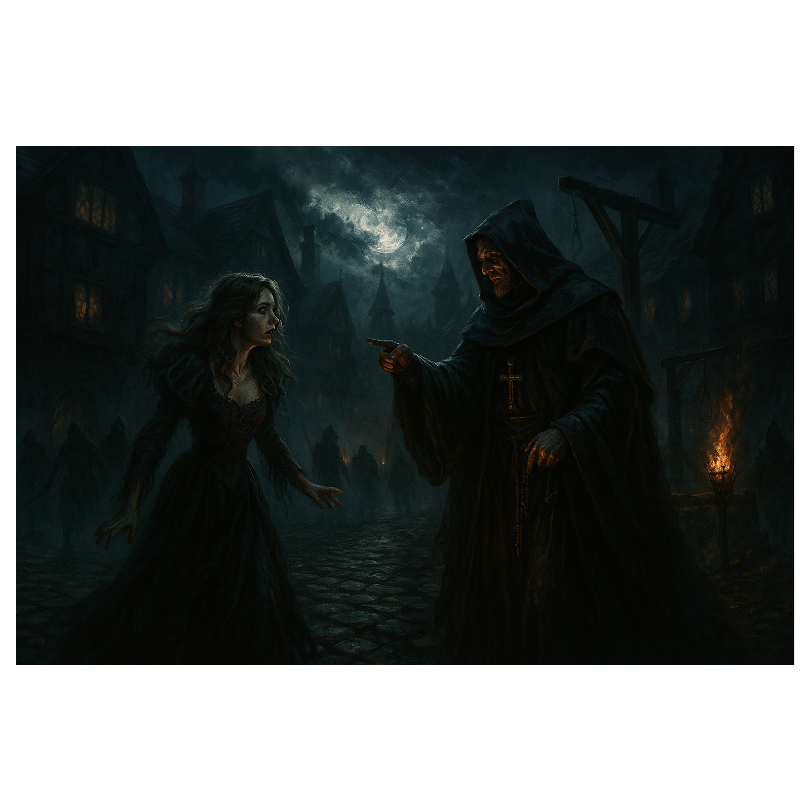 Gothic-folk/metal melodic track, dark, atmospheric, cinematic, Female vocals only (Elyra), ethereal, haunting, soft yet emotional, Tempo 90–105 BPM, Instrumentation: clear distorted guitars, deep bass, steady drums, cinematic strings, ambient synths, Verses intimate, atmospheric, whispered; choruses dramatic but melodic, reflecting fear, superstition, and tension, Theme: 17th-century village, witnessing witch trials, fear and helplessness, horror of social panic, observing innocent souls burned, psychological tension, ~4:00 min