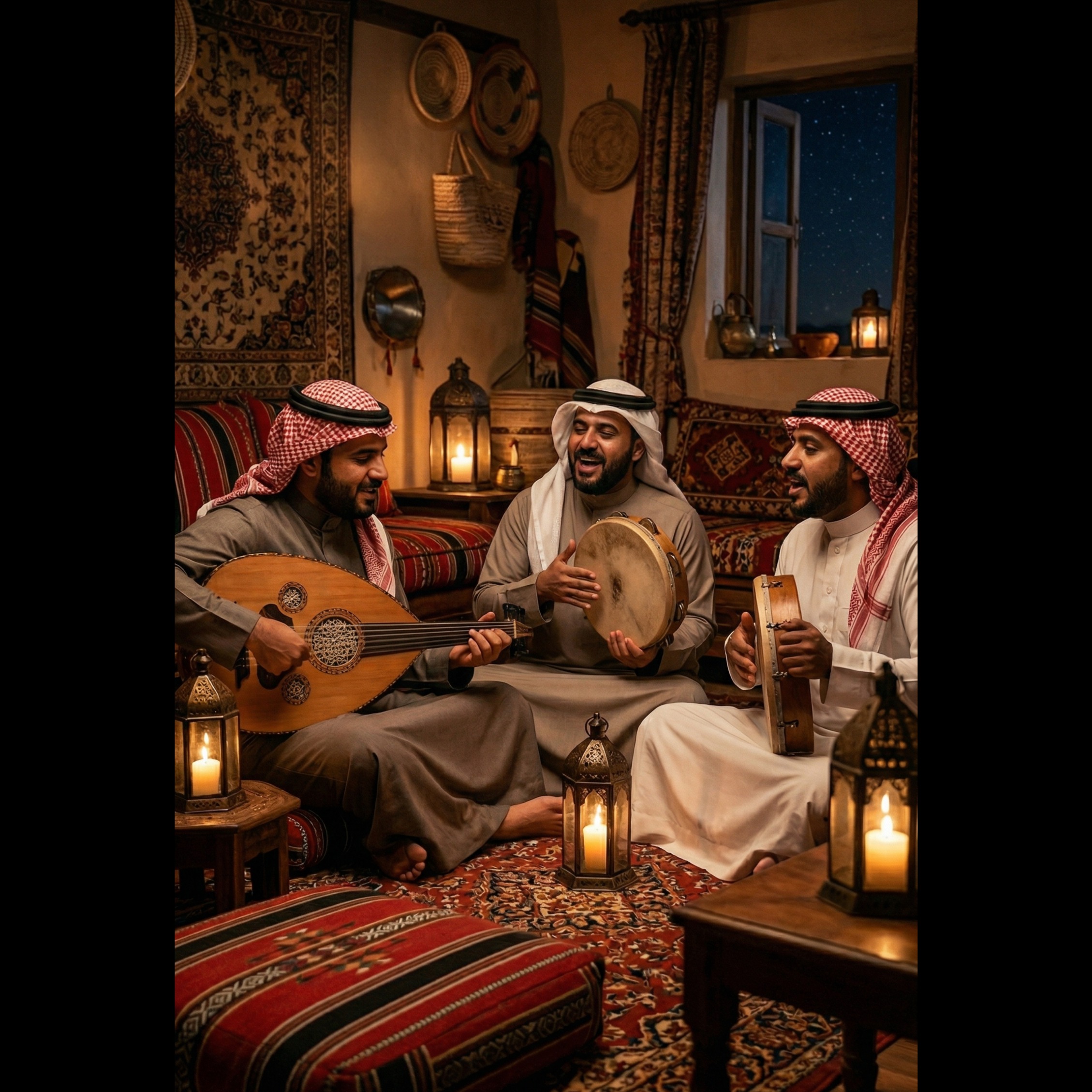 Traditional Saudi Samri, 75 BPM, deep resonant Daf (frame drum), intricate Riqq, soulful acoustic Oud solos, emotive male tenor, traditional Arabic maqam, cinematic desert ambiance, lush string section, small male chorus backing, immersive high-fidelity studio mix, wide stereo field, long instrumental interludes