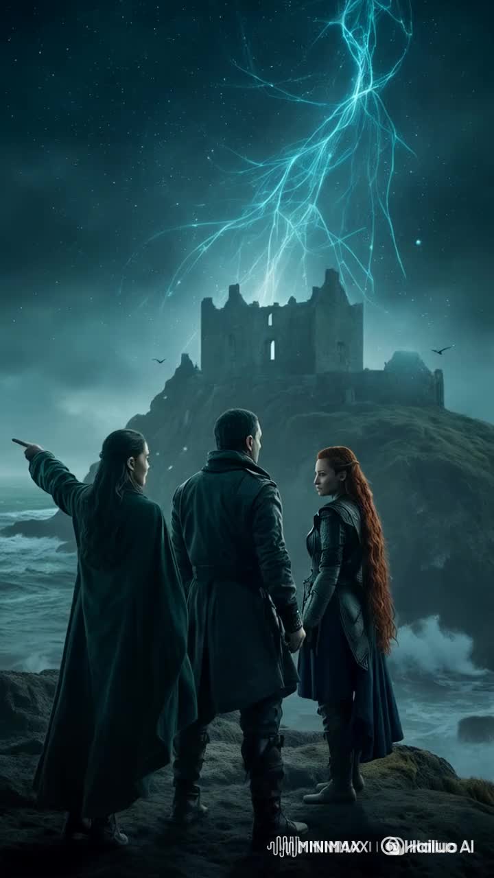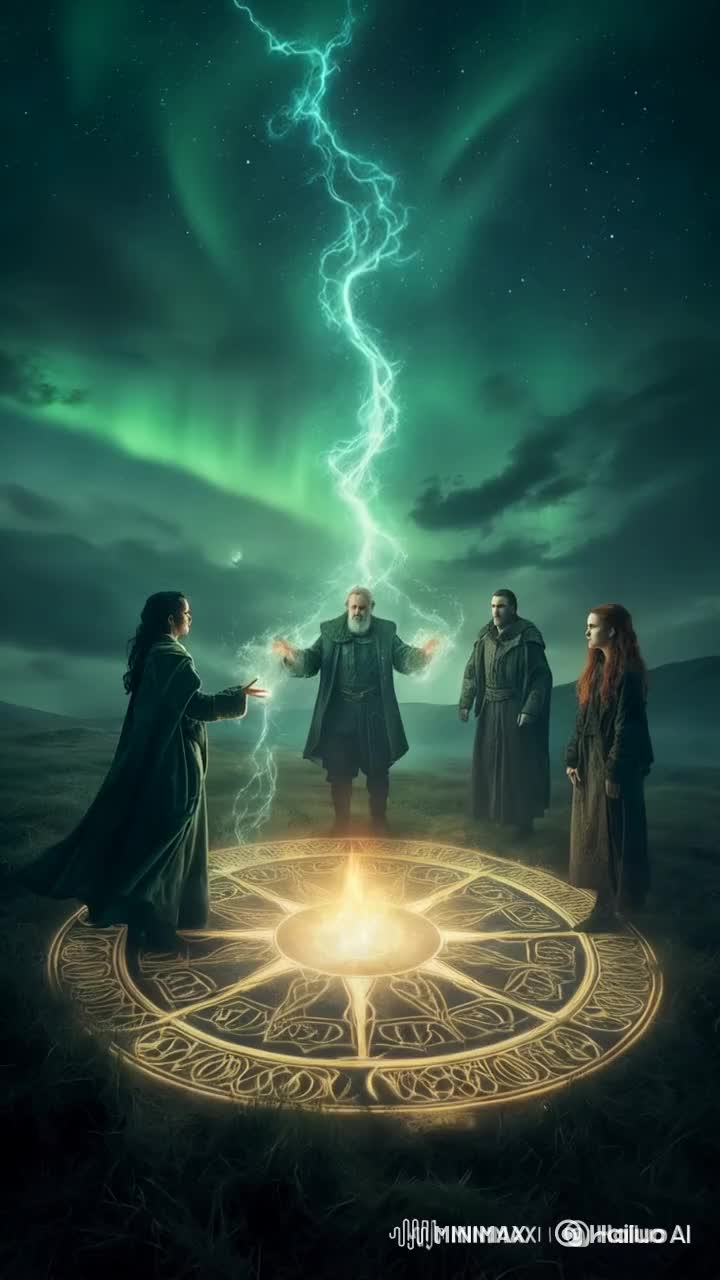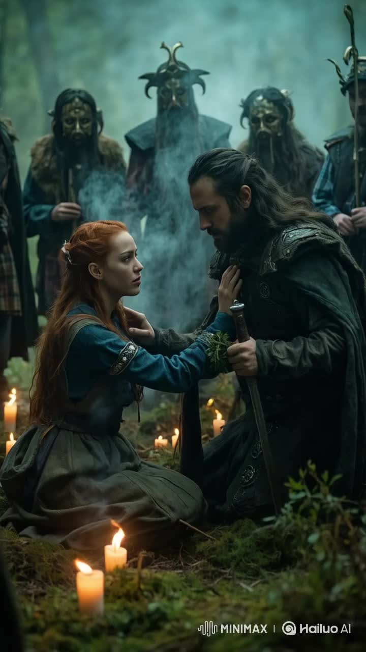 Cinematic intro with Scottish bagpipes slowly building tension, A deep male voice speaks in Scottish Gaelic, creating a mystical, ritual atmosphere, Then, the music shifts into progressive metal with complex rhythms (7/8, polyrhythms), blending Scottish folk (fiddle, pipes, percussion) with heavy modern guitars, Verses 1 & 4: male voice (dark, powerful), Verses 2 & 5: female voice (raspy, strong), Verses 3 & 6: both singers in duet, All choruses are sung together, First verses are heavy, dissonant, with palm-mute guitars and constant folk textures, Drums are intricate, never pop, with aggressive snares and detailed kick patterns, Chorus is epic, orchestral, layered, Bridge is spoken by a joyful Scottish male voice (thick accent), shifting tone, Post-bridge, music becomes warmer and hopeful, while staying complex, Final chorus includes both singers and a powerful Scottish choir to enhance the epic climax