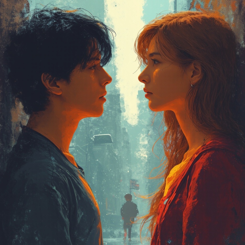 Pop violin, emotive piano, layered strings, delicate percussion, tender tone, mid-tempo, dynamic builds, duet vocals, emotional tension, cinematic atmosphere, minimalistic arrangement