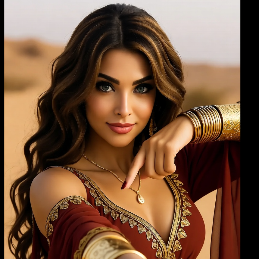 A hypnotic fusion of Arabic dance rhythms, deep bass, trance energy, and cinematic ambience, Mystical belly-dance groove with oud, darbuka, and shimmering synths, Breathy female vocals blend poetic storytelling with percussive chant hooks, mixing ancient desert mysticism and modern EDM drive, Amber dusk on satin skin, veils of fire, shadows spin we are the rhythm, we are the flame