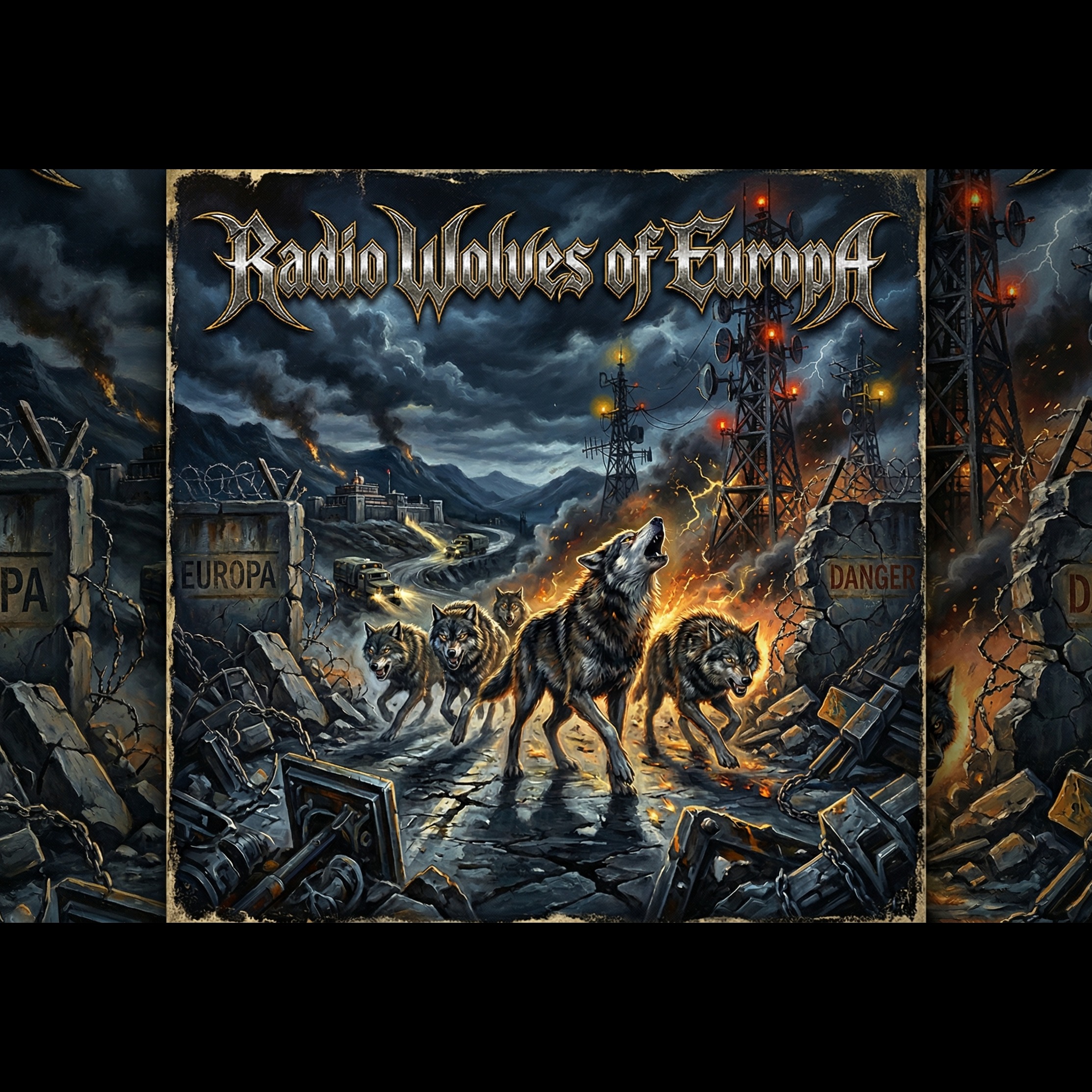 European underground traditional heavy metal, 1990s to now, built from obscure continental steel rather than any one band, Title: Radio Wolves of Europa, Key: A minor, Tempo: 149 BPM, Use tight 4/4 drums, galloping rhythm guitars, melodic bass that stays audible, twin-lead harmonies, sharp but concise solos, and a clear mix with analog grit, Vocals: forceful male tenor, gritty midrange, high chorus lift, crowd chants, no pop gloss, Mood: cold-war ghost road metal; imagery and subtext: radio towers, wolves, borders, night drive, Arrangement: short cold intro, riff-heavy verse, rising pre-chorus, huge anthem chorus, second verse with more lead motion, bridge, solo, final double chorus, Direction: Germanic dystopian classic steel, Crowd chant: Neon blades of reckless hearts under gold banners