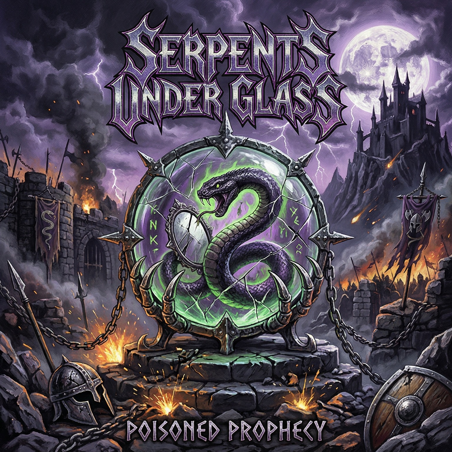 European underground traditional heavy metal, 1990s to now, built from obscure continental steel rather than any one band, Title: Serpents Under Glass, Key: G minor, Tempo: 146 BPM, Use tight 4/4 drums, galloping rhythm guitars, melodic bass that stays audible, twin-lead harmonies, sharp but concise solos, and a clear mix with analog grit, Vocals: forceful male tenor, gritty midrange, high chorus lift, crowd chants, no pop gloss, Mood: poisoned prophecy metal; imagery and subtext: venom, mirrors, prophecy, betrayal, Arrangement: short cold intro, riff-heavy verse, rising pre-chorus, huge anthem chorus, second verse with more lead motion, bridge, solo, final double chorus, Direction: French-German dark traditional metal, Crowd chant: Midnight and sacred noise and signal fire beyond midnight