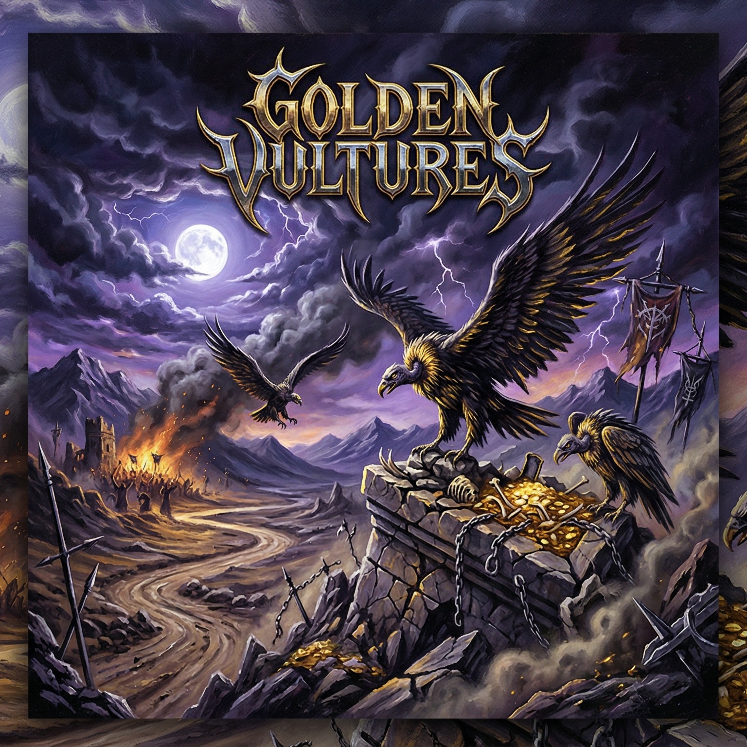 European underground traditional heavy metal, 1990s to now, built from obscure continental steel rather than any one band, Title: Golden Vultures, Key: C minor, Tempo: 153 BPM, Use tight 4/4 drums, galloping rhythm guitars, melodic bass that stays audible, twin-lead harmonies, sharp but concise solos, and a clear mix with analog grit, Vocals: forceful male tenor, gritty midrange, high chorus lift, crowd chants, no pop gloss, Mood: desert-road heavy metal; imagery and subtext: vultures, gold dust, hunger, rise, Arrangement: short cold intro, riff-heavy verse, rising pre-chorus, huge anthem chorus, second verse with more lead motion, bridge, solo, final double chorus, Direction: Pan-European melodic traditional metal, Crowd chant: Venom sky and loud glory through grave dust under nightbound!