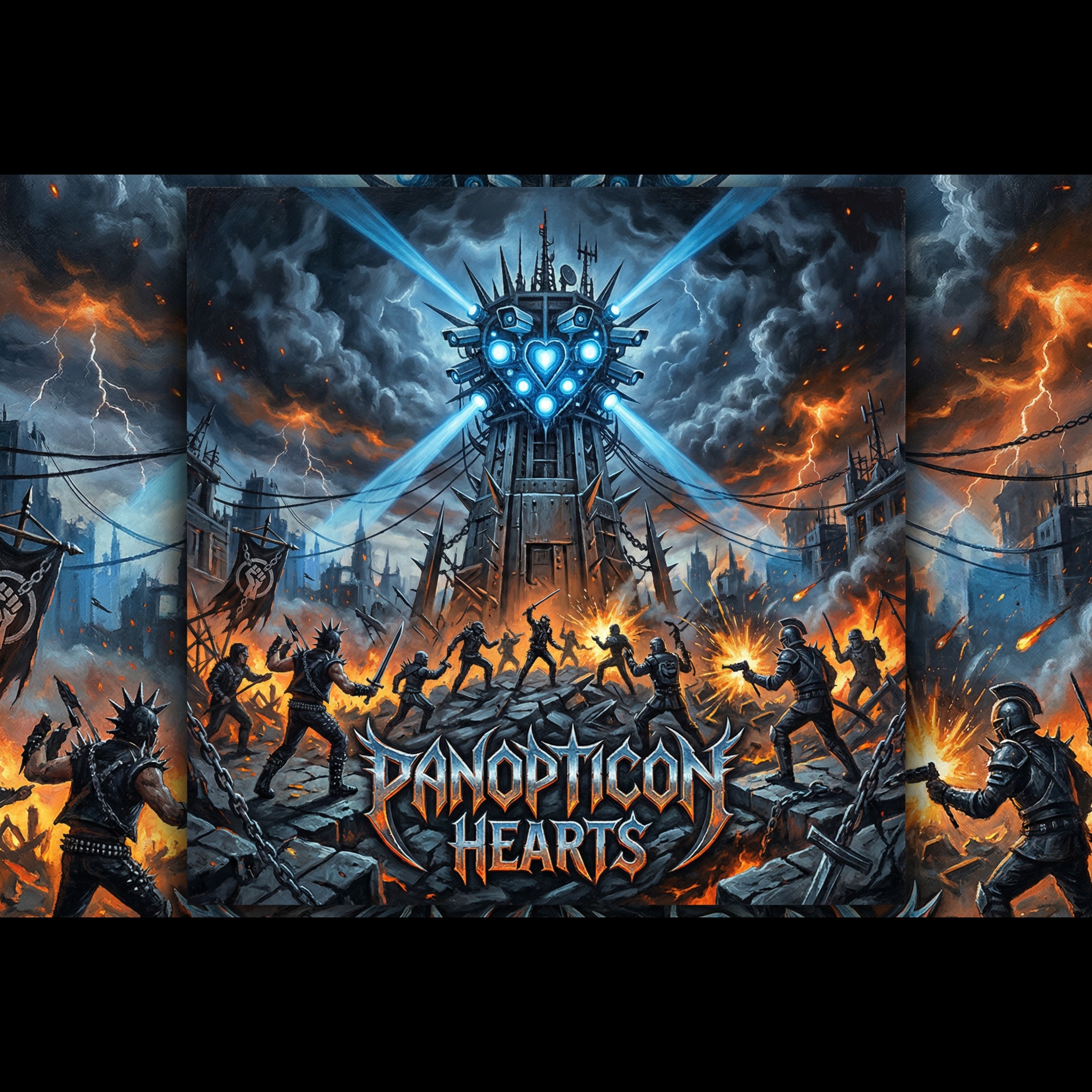 European underground traditional heavy metal, 1990s to now, built from obscure continental steel rather than any one band, Title: Panopticon Hearts, Key: E minor, Tempo: 148 BPM, Use tight 4/4 drums, galloping rhythm guitars, melodic bass that stays audible, twin-lead harmonies, sharp but concise solos, and a clear mix with analog grit, Vocals: forceful male tenor, gritty midrange, high chorus lift, crowd chants, no pop gloss, Mood: dystopian surveillance metal; imagery and subtext: towers, wires, secret revolt, Arrangement: short cold intro, riff-heavy verse, rising pre-chorus, huge anthem chorus, second verse with more lead motion, bridge, solo, final double chorus, Direction: Germanic dystopian classic steel, Crowd chant: Fearless steel through iron wolves and nightbound of iron wolves!