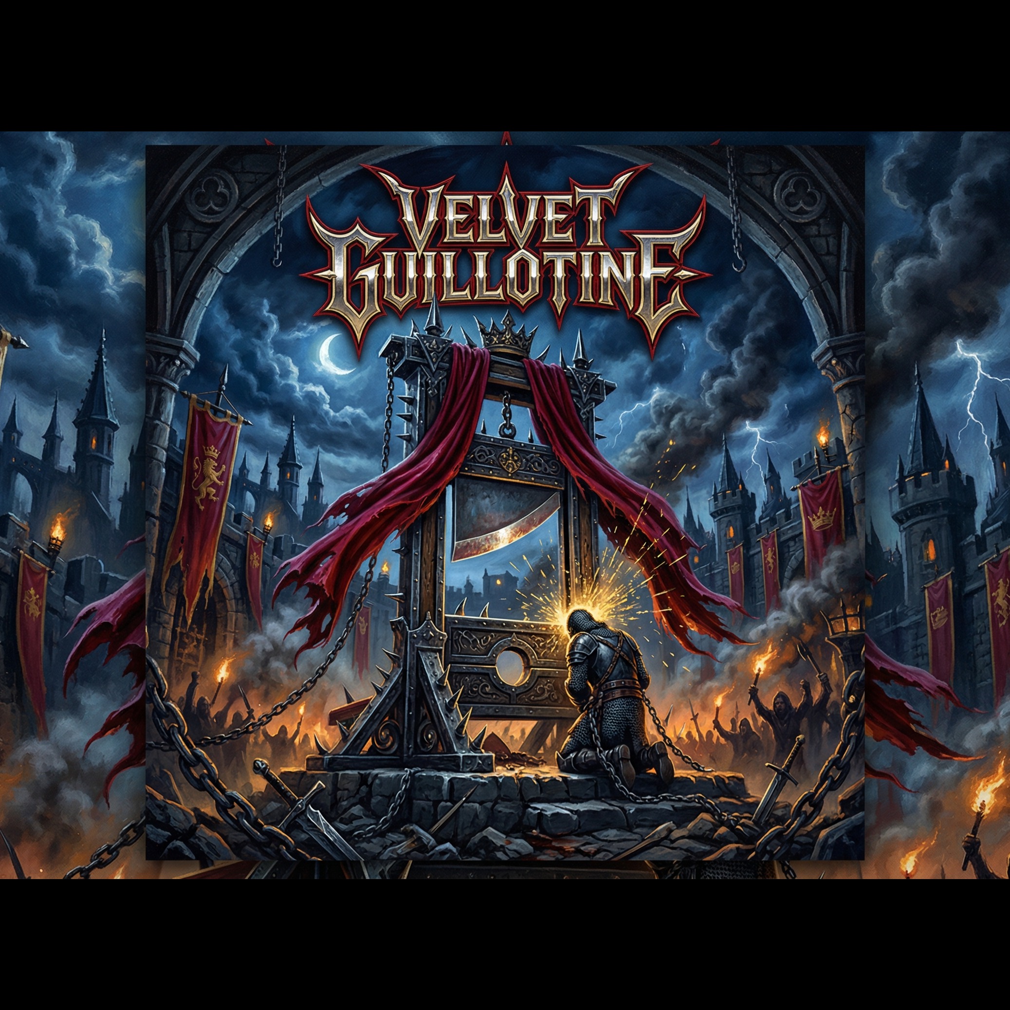 European underground traditional heavy metal, 1990s to now, built from obscure continental steel rather than any one band, Title: Velvet Guillotine, Key: F minor, Tempo: 140 BPM, Use tight 4/4 drums, galloping rhythm guitars, melodic bass that stays audible, twin-lead harmonies, sharp but concise solos, and a clear mix with analog grit, Vocals: forceful male tenor, gritty midrange, high chorus lift, crowd chants, no pop gloss, Mood: dark regal heavy metal; imagery and subtext: crimson halls, elegance, execution, Arrangement: short cold intro, riff-heavy verse, rising pre-chorus, huge anthem chorus, second verse with more lead motion, bridge, solo, final double chorus, Direction: French-German dark traditional metal, Crowd chant: Iron flame through final flame of shadow kings of loud glory!