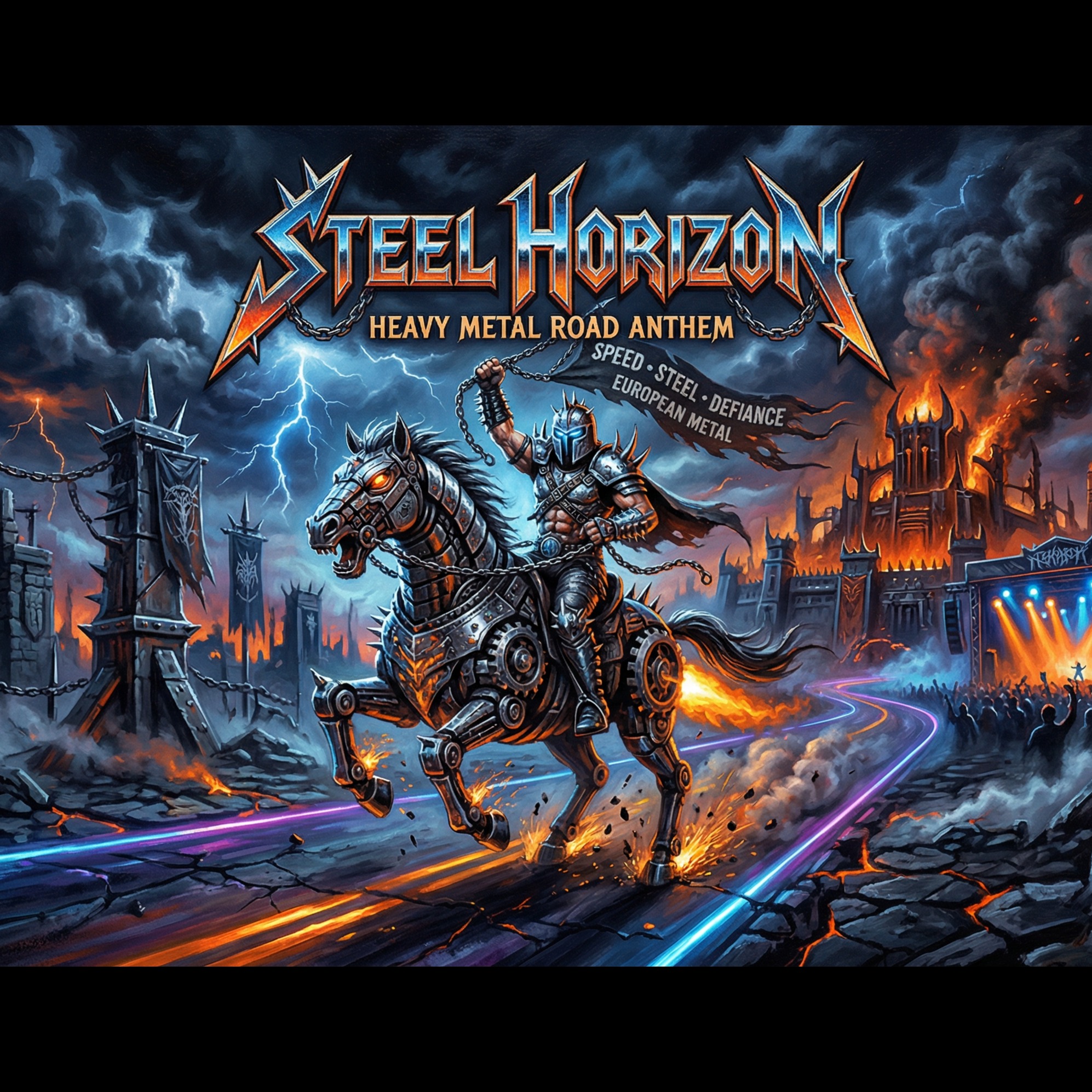 European underground traditional heavy metal, 1990s to now, built from obscure continental steel rather than any one band, Title: Steel Horizon, Key: E minor, Tempo: 166 BPM, Use tight 4/4 drums, galloping rhythm guitars, melodic bass that stays audible, twin-lead harmonies, sharp but concise solos, and a clear mix with analog grit, Vocals: forceful male tenor, gritty midrange, high chorus lift, crowd chants, no pop gloss, Mood: speed-steel road anthem; imagery and subtext: galloping steel, neon highways, fists-up defiance, Arrangement: short cold intro, riff-heavy verse, rising pre-chorus, huge anthem chorus, second verse with more lead motion, bridge, solo, final double chorus, Direction: Swedish revivalist heavy/speed metal, Crowd chant: Fearless steel through burning crowns, stormborn