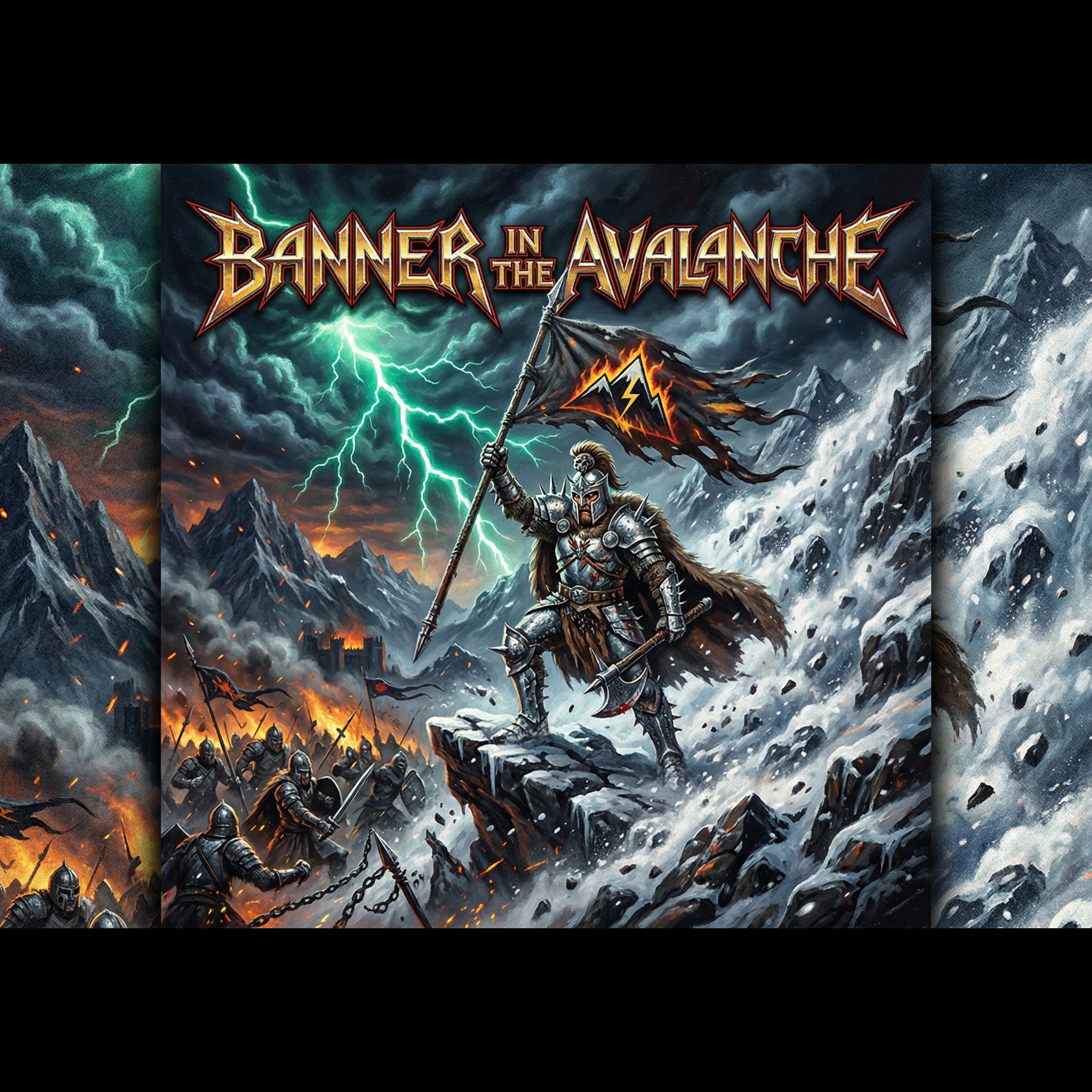 European underground traditional heavy metal, 1990s to now, built from obscure continental steel rather than any one band, Title: Banner in the Avalanche, Key: D minor, Tempo: 156 BPM, Use tight 4/4 drums, galloping rhythm guitars, melodic bass that stays audible, twin-lead harmonies, sharp but concise solos, and a clear mix with analog grit, Vocals: forceful male tenor, gritty midrange, high chorus lift, crowd chants, no pop gloss, Mood: mountain war hymn; imagery and subtext: mountains, avalanche, standard, last stand, Arrangement: short cold intro, riff-heavy verse, rising pre-chorus, huge anthem chorus, second verse with more lead motion, bridge, solo, final double chorus, Direction: Teutonic-Nordic battle metal, Crowd chant: Signal fire, free hearts and reckless hearts under venom sky