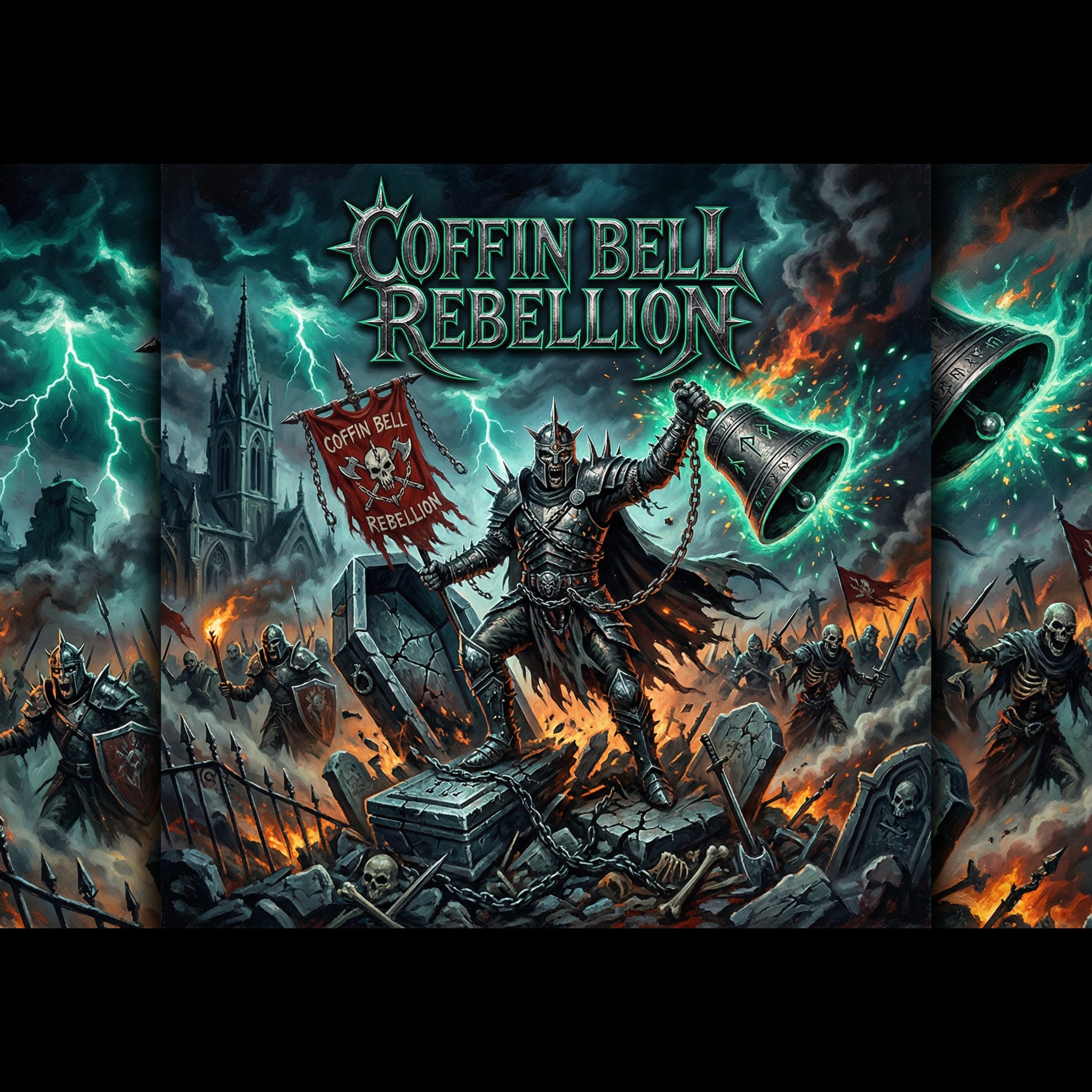 European underground traditional heavy metal, 1990s to now, built from obscure continental steel rather than any one band, Title: Coffin Bell Rebellion, Key: D minor, Tempo: 154 BPM, Use tight 4/4 drums, galloping rhythm guitars, melodic bass that stays audible, twin-lead harmonies, sharp but concise solos, and a clear mix with analog grit, Vocals: forceful male tenor, gritty midrange, high chorus lift, crowd chants, no pop gloss, Mood: graveyard uprising metal; imagery and subtext: coffin bells, rebels, cemetery thunder, Arrangement: short cold intro, riff-heavy verse, rising pre-chorus, huge anthem chorus, second verse with more lead motion, bridge, solo, final double chorus, Direction: French-German dark traditional metal, Crowd chant: Storm rails through grave dust through neon blades