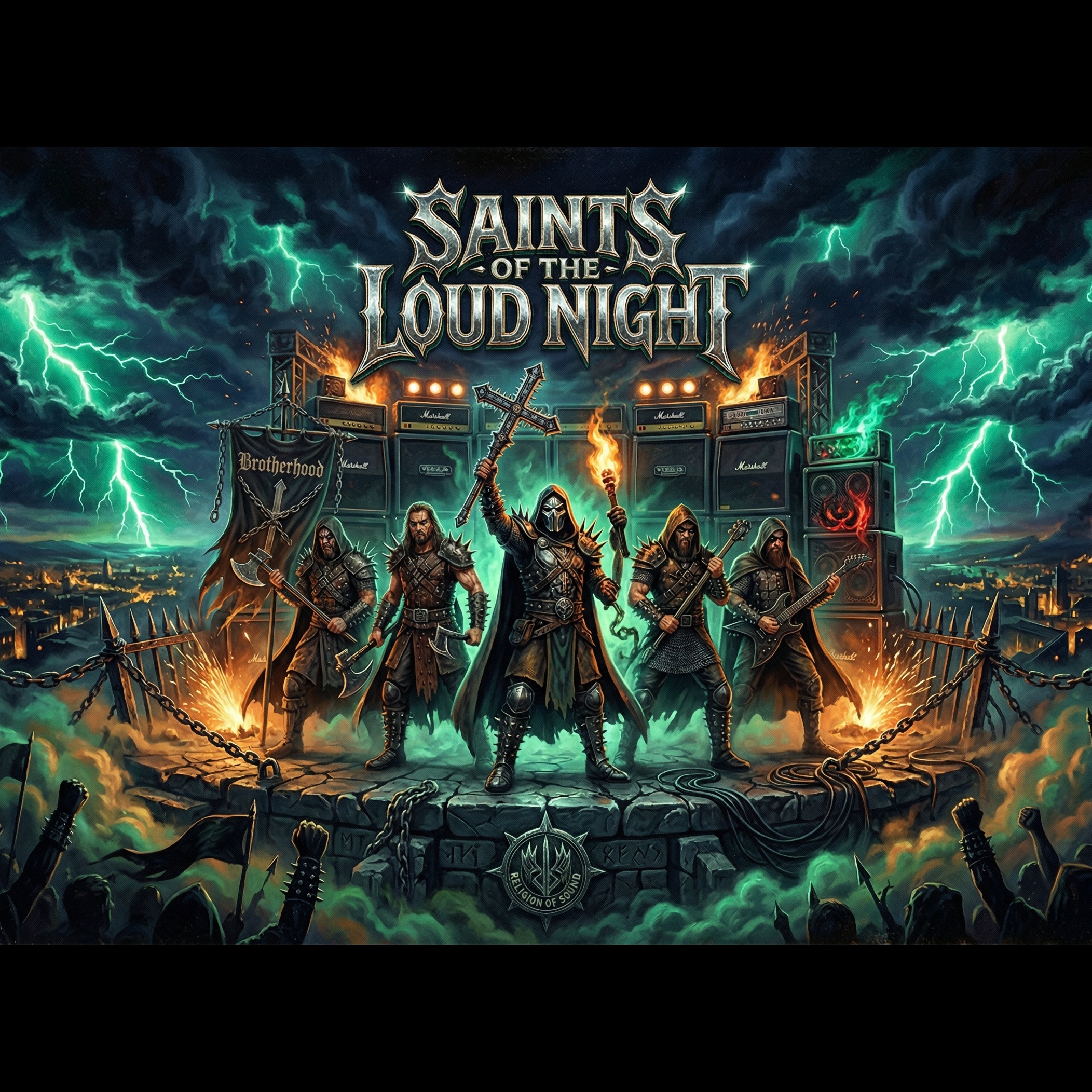 European underground traditional heavy metal, 1990s to now, built from obscure continental steel rather than any one band, Title: Saints of the Loud Night, Key: A major, Tempo: 148 BPM, Use tight 4/4 drums, galloping rhythm guitars, melodic bass that stays audible, twin-lead harmonies, sharp but concise solos, and a clear mix with analog grit, Vocals: forceful male tenor, gritty midrange, high chorus lift, crowd chants, no pop gloss, Mood: metal brotherhood anthem; imagery and subtext: brotherhood, amps, city lights, religion of sound, Arrangement: short cold intro, riff-heavy verse, rising pre-chorus, huge anthem chorus, second verse with more lead motion, bridge, solo, final double chorus, Direction: Pan-European melodic traditional metal, Crowd chant: Reborn sons, free hearts, venom sky