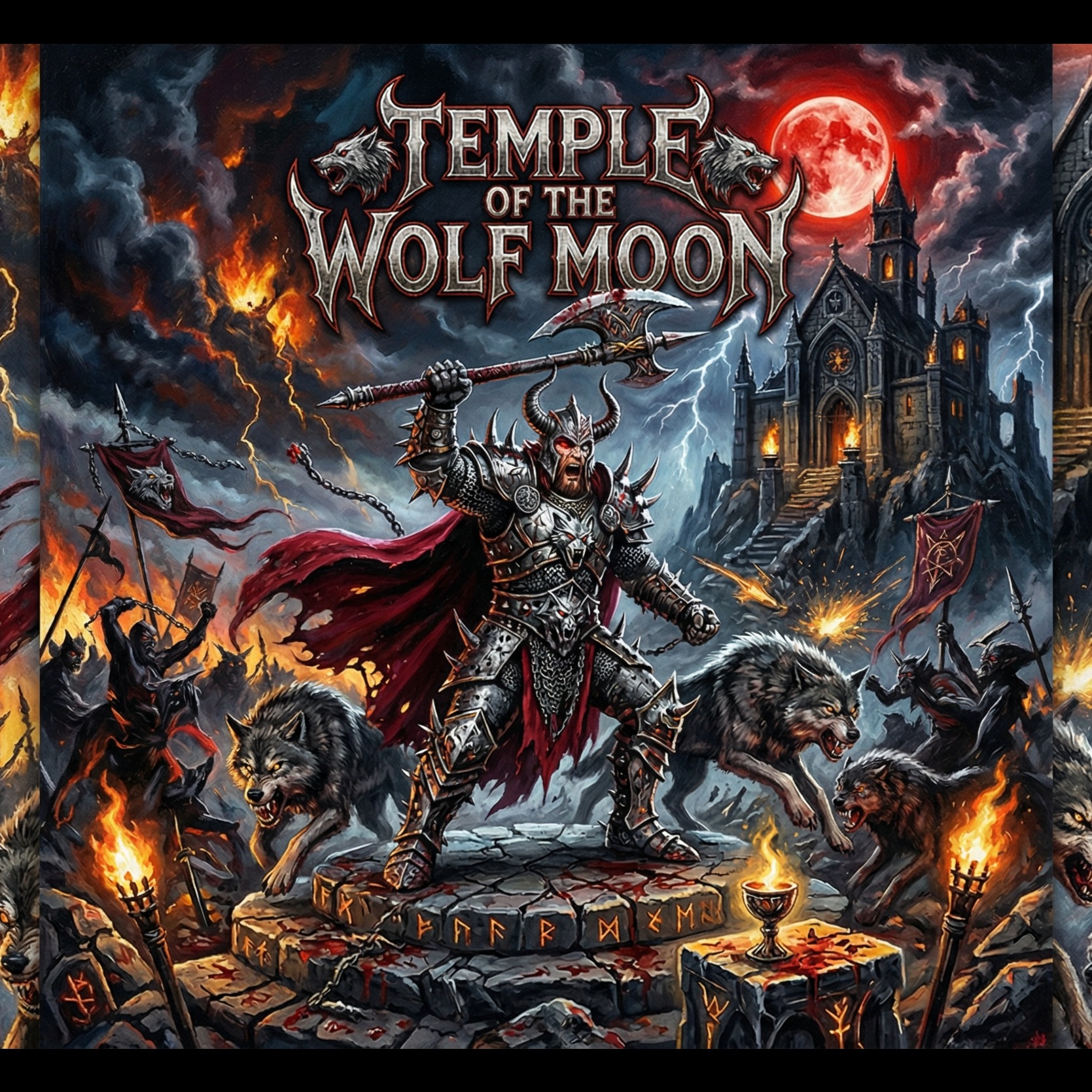 European underground traditional heavy metal, 1990s to now, built from obscure continental steel rather than any one band, Title: Black Lantern Rite, Key: E minor, Tempo: 142 BPM, Use tight 4/4 drums, galloping rhythm guitars, melodic bass that stays audible, twin-lead harmonies, sharp but concise solos, and a clear mix with analog grit, Vocals: forceful male tenor, gritty midrange, high chorus lift, crowd chants, no pop gloss, Mood: occult midnight heavy metal; imagery and subtext: lanterns, shadows, ancient vow, Arrangement: short cold intro, riff-heavy verse, rising pre-chorus, huge anthem chorus, second verse with more lead motion, bridge, solo, final double chorus, Direction: French-German dark traditional metal, Crowd chant: Wolf blood under loud glory and loud glory of holy thunder!