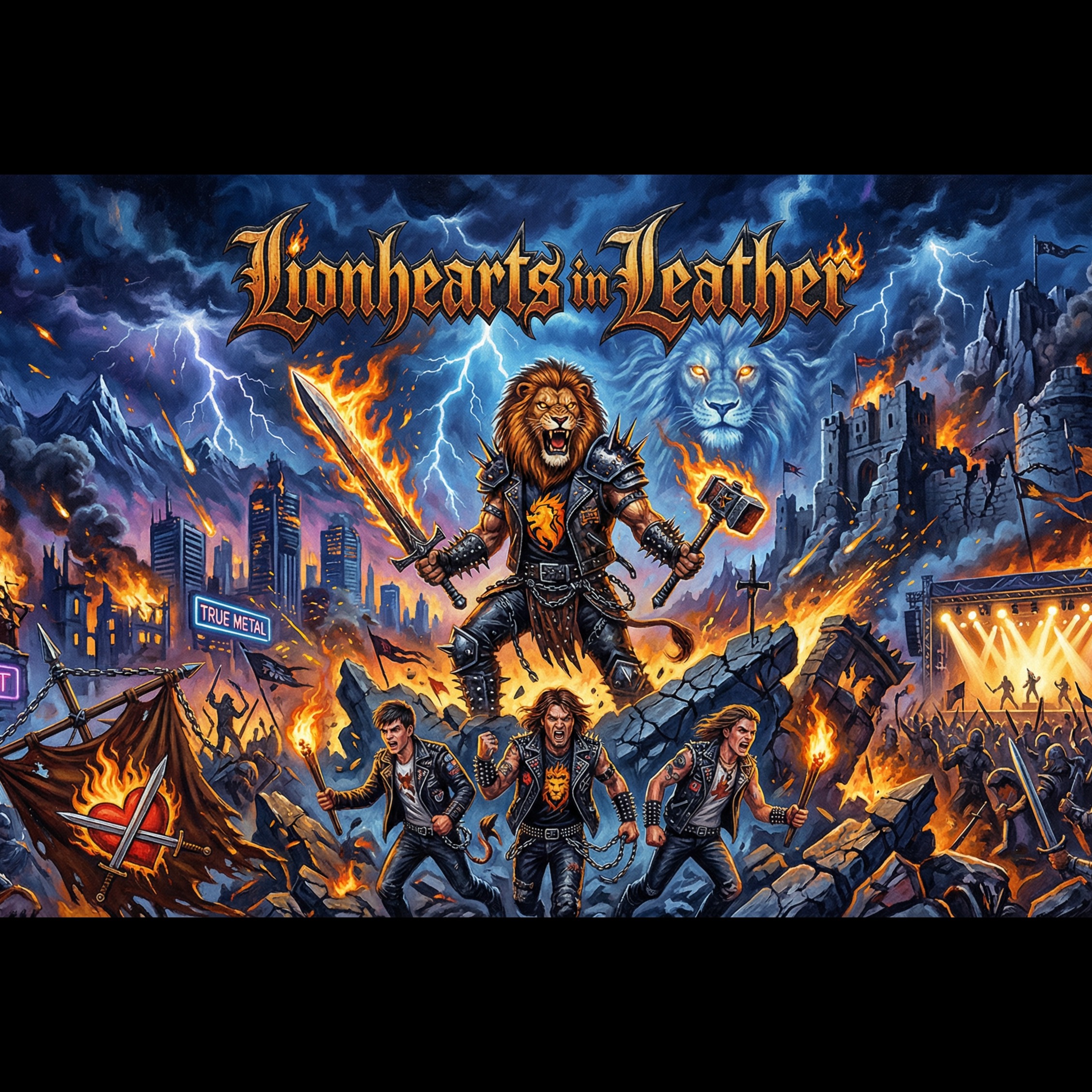 European underground traditional heavy metal, 1990s to now, built from obscure continental steel rather than any one band, Title: Lionhearts in Leather, Key: E major, Tempo: 156 BPM, Use tight 4/4 drums, galloping rhythm guitars, melodic bass that stays audible, twin-lead harmonies, sharp but concise solos, and a clear mix with analog grit, Vocals: forceful male tenor, gritty midrange, high chorus lift, crowd chants, no pop gloss, Mood: streetwise classic heavy metal; imagery and subtext: leather, youth, neon, loyalty, Arrangement: short cold intro, riff-heavy verse, rising pre-chorus, huge anthem chorus, second verse with more lead motion, bridge, solo, final double chorus, Direction: Pan-European melodic traditional metal, Crowd chant: Grave dust through iron wolves under fearless steel!