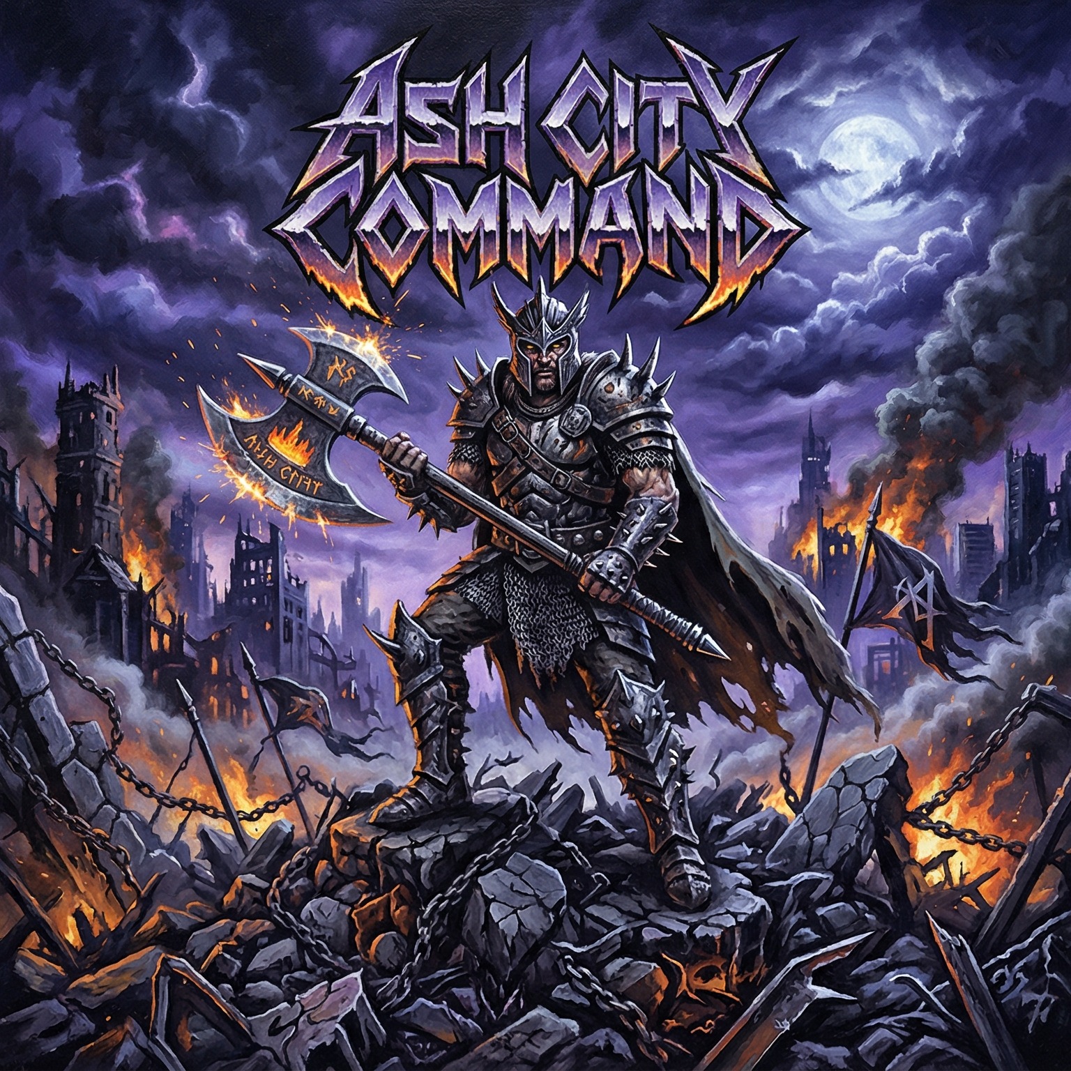 European underground traditional heavy metal, 1990s to now, built from obscure continental steel rather than any one band, Title: Ash City Command, Key: D minor, Tempo: 146 BPM, Use tight 4/4 drums, galloping rhythm guitars, melodic bass that stays audible, twin-lead harmonies, sharp but concise solos, and a clear mix with analog grit, Vocals: forceful male tenor, gritty midrange, high chorus lift, crowd chants, no pop gloss, Mood: urban apocalyptic metal; imagery and subtext: ash city, blackouts, resistance, Arrangement: short cold intro, riff-heavy verse, rising pre-chorus, huge anthem chorus, second verse with more lead motion, bridge, solo, final double chorus, Direction: Germanic dystopian classic steel, Crowd chant: Free hearts and iron flame of embers, ashes, neon blades, black fire