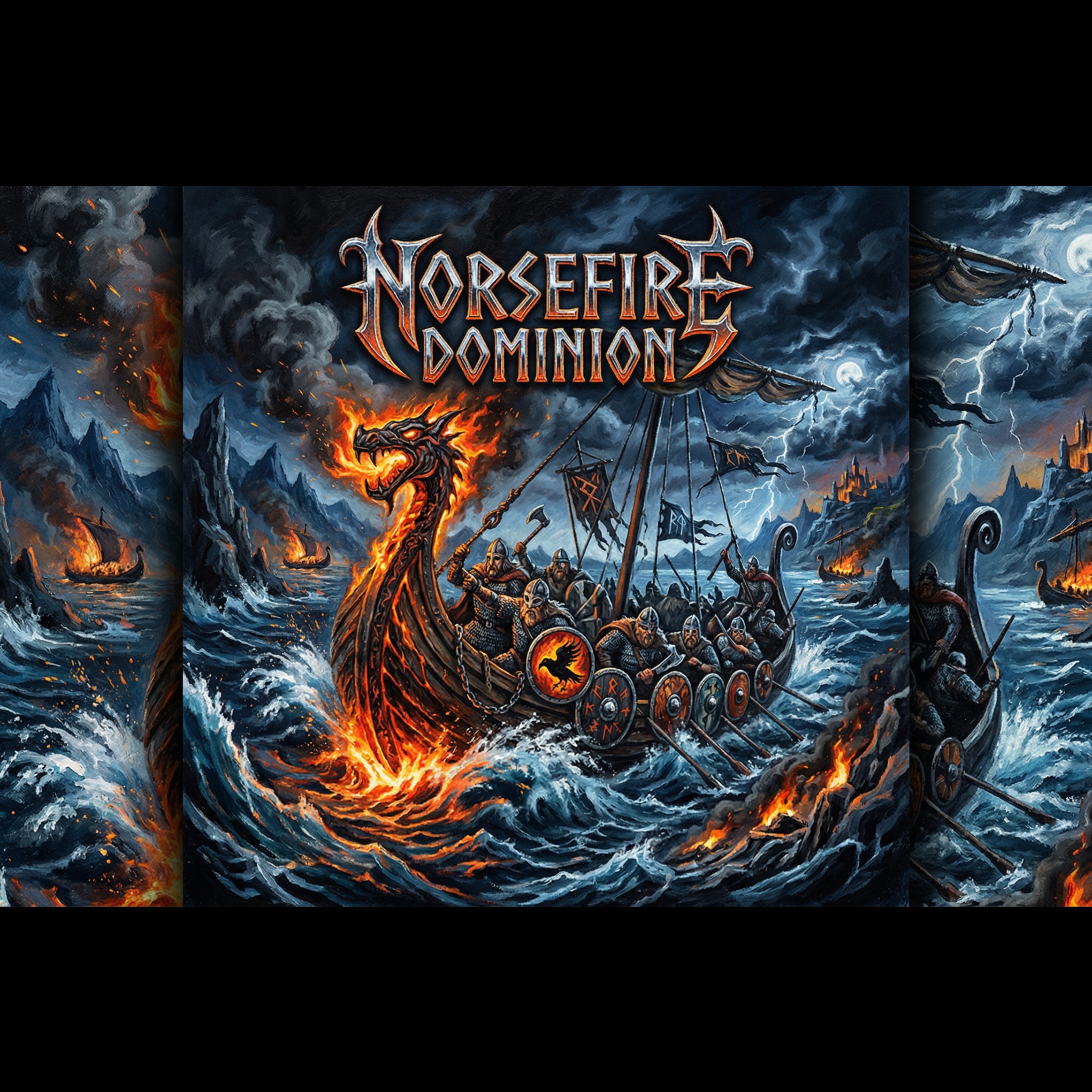 European underground traditional heavy metal, 1990s to now, built from obscure continental steel rather than any one band, Title: Norsefire Dominion, Key: E minor, Tempo: 168 BPM, Use tight 4/4 drums, galloping rhythm guitars, melodic bass that stays audible, twin-lead harmonies, sharp but concise solos, and a clear mix with analog grit, Vocals: forceful male tenor, gritty midrange, high chorus lift, crowd chants, no pop gloss, Mood: northern battle speed metal; imagery and subtext: sea storm, shields, blazing prows, Arrangement: short cold intro, riff-heavy verse, rising pre-chorus, huge anthem chorus, second verse with more lead motion, bridge, solo, final double chorus, Direction: Teutonic-Nordic battle metal, Crowd chant: Burning crowns, roaring night, battle cry, unbroken steel, ashes