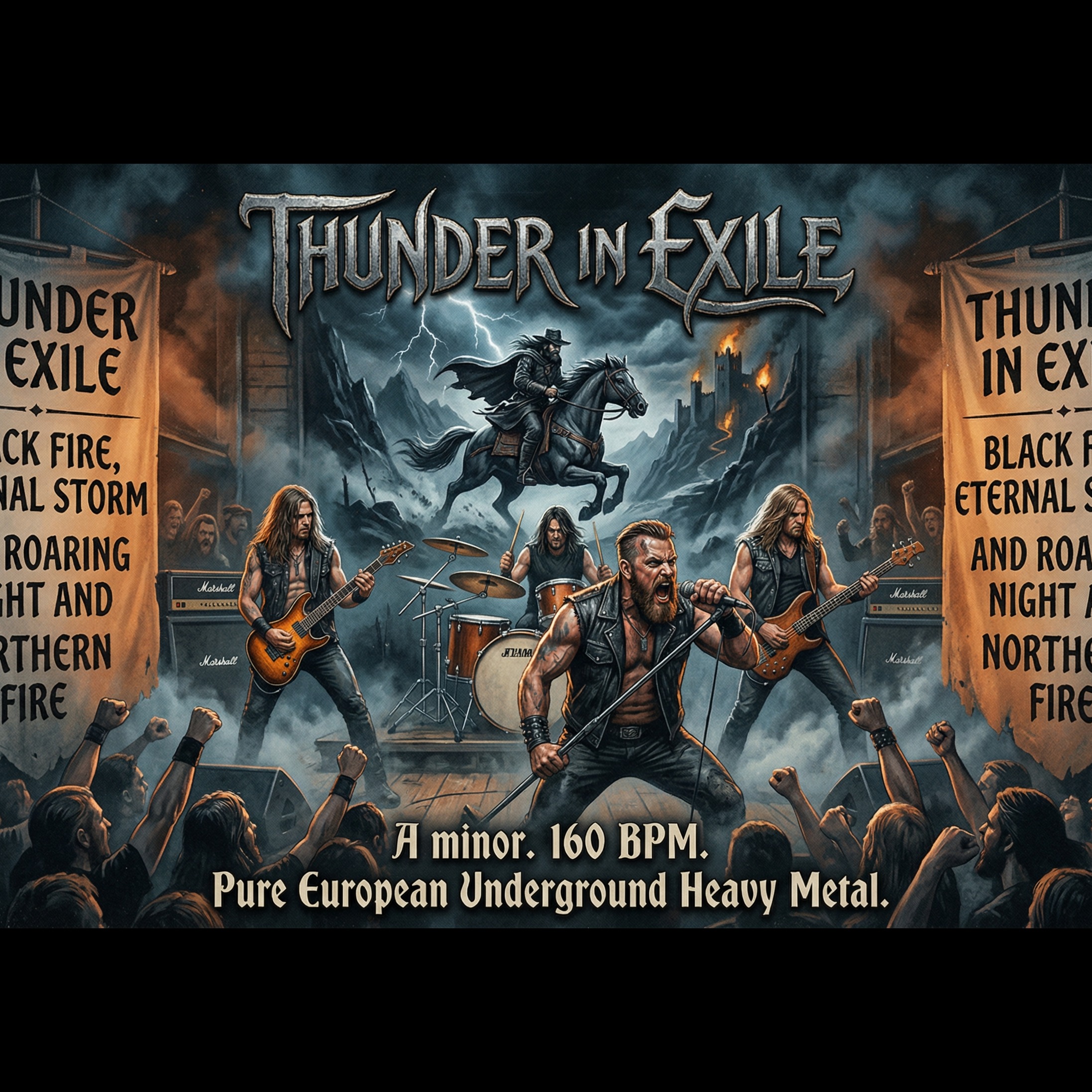 European underground traditional heavy metal, 1990s to now, built from obscure continental steel rather than any one band, Title: Thunder in Exile, Key: A minor, Tempo: 160 BPM, Use tight 4/4 drums, galloping rhythm guitars, melodic bass that stays audible, twin-lead harmonies, sharp but concise solos, and a clear mix with analog grit, Vocals: forceful male tenor, gritty midrange, high chorus lift, crowd chants, no pop gloss, Mood: stormbound outlaw anthem; imagery and subtext: exile, thunder, wind-borne return, Arrangement: short cold intro, riff-heavy verse, rising pre-chorus, huge anthem chorus, second verse with more lead motion, bridge, solo, final double chorus, Direction: Swedish revivalist heavy/speed metal, Crowd chant: Black fire, eternal storm and roaring night and northern fire