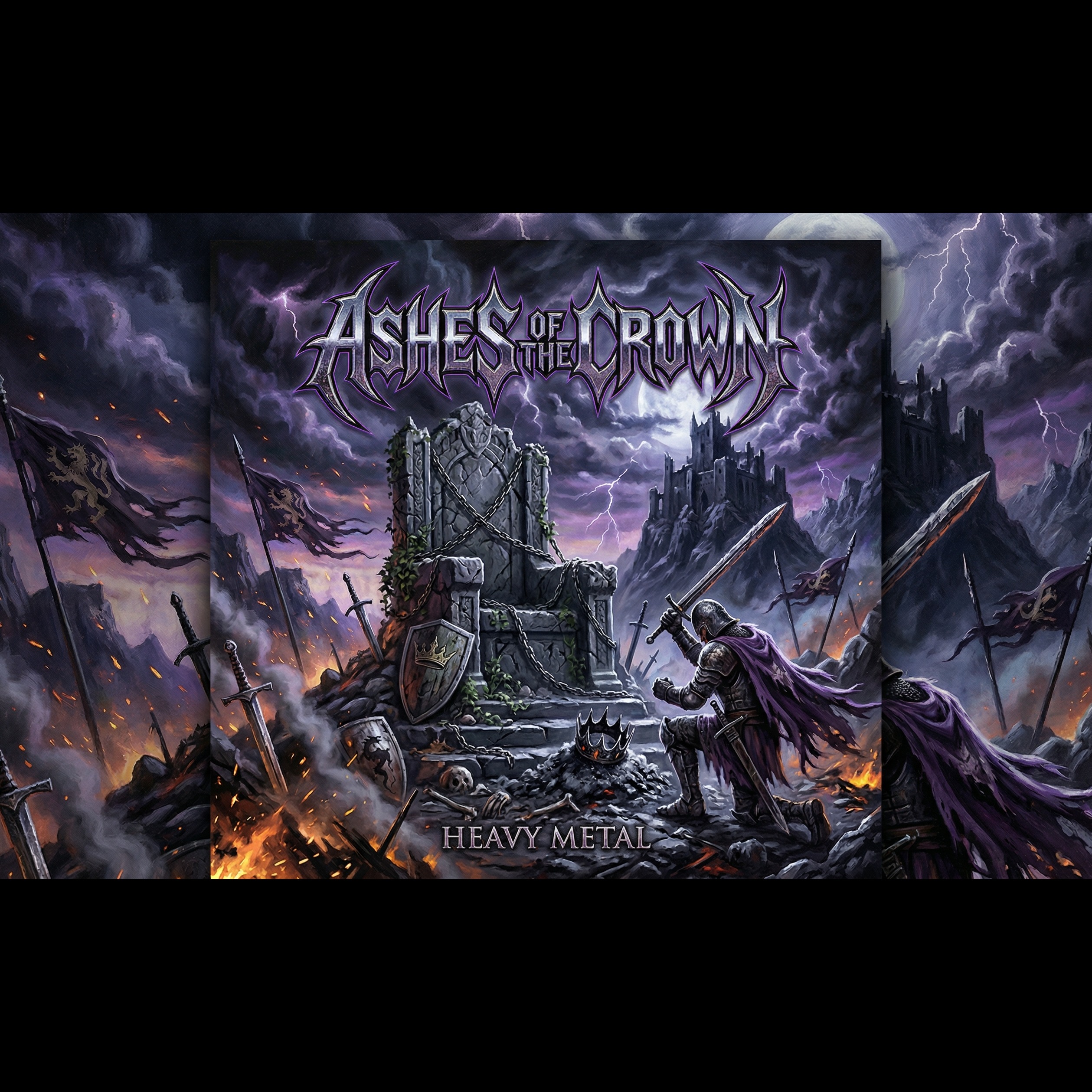 European underground traditional heavy metal, 1990s to now, built from obscure continental steel rather than any one band, Title: Ashes of the Crown, Key: D minor, Tempo: 148 BPM, Use tight 4/4 drums, galloping rhythm guitars, melodic bass that stays audible, twin-lead harmonies, sharp but concise solos, and a clear mix with analog grit, Vocals: forceful male tenor, gritty midrange, high chorus lift, crowd chants, no pop gloss, Mood: fallen-kingdom heavy metal; imagery and subtext: ruined throne, banners, oath and vengeance, Arrangement: short cold intro, riff-heavy verse, rising pre-chorus, huge anthem chorus, second verse with more lead motion, bridge, solo, final double chorus, Direction: Swedish revivalist heavy/speed metal, Crowd chant: Wolf blood of eternal storm through scarlet dawn