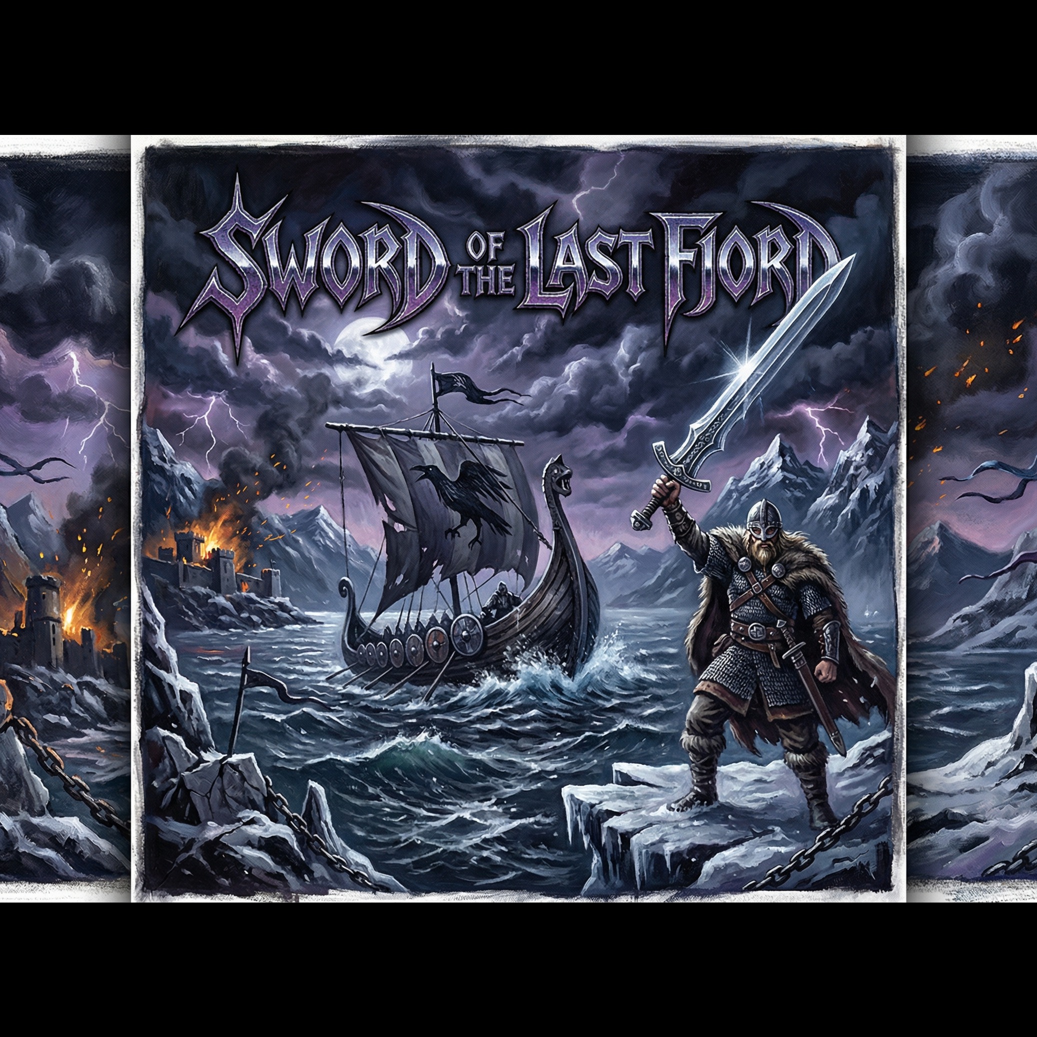 European underground traditional heavy metal, 1990s to now, built from obscure continental steel rather than any one band, Title: Sword of the Last Fjord, Key: B minor, Tempo: 150 BPM, Use tight 4/4 drums, galloping rhythm guitars, melodic bass that stays audible, twin-lead harmonies, sharp but concise solos, and a clear mix with analog grit, Vocals: forceful male tenor, gritty midrange, high chorus lift, crowd chants, no pop gloss, Mood: heroic maritime metal; imagery and subtext: fjord, longship, winter oath, Arrangement: short cold intro, riff-heavy verse, rising pre-chorus, huge anthem chorus, second verse with more lead motion, bridge, solo, final double chorus, Direction: Teutonic-Nordic battle metal, Crowd chant: Holy thunder through scarlet dawn of reckless hearts under wolf blood!
