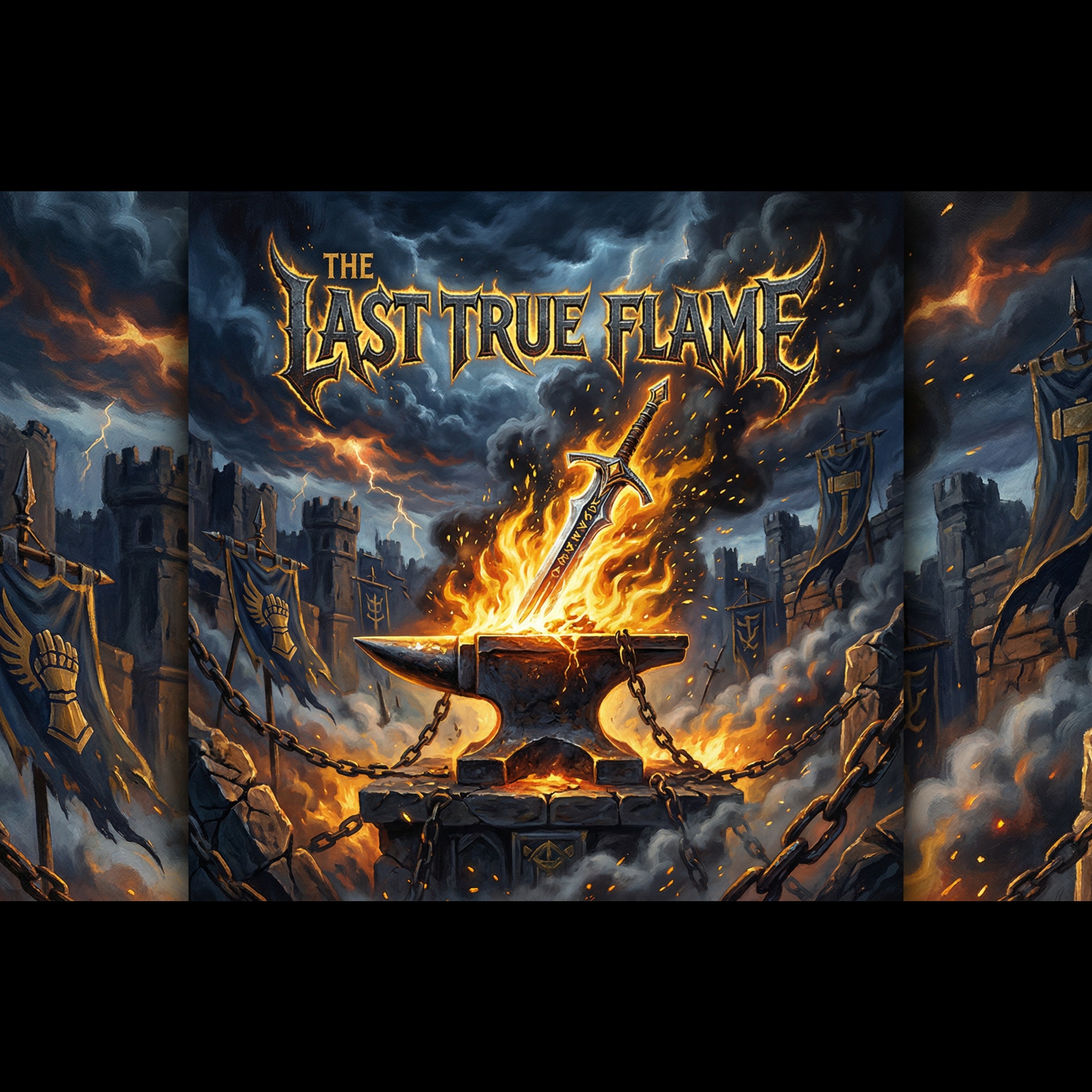 European underground traditional heavy metal, 1990s to now, built from obscure continental steel rather than any one band, Title: The Last True Flame, Key: D minor, Tempo: 145 BPM, Use tight 4/4 drums, galloping rhythm guitars, melodic bass that stays audible, twin-lead harmonies, sharp but concise solos, and a clear mix with analog grit, Vocals: forceful male tenor, gritty midrange, high chorus lift, crowd chants, no pop gloss, Mood: manifesto heavy metal; imagery and subtext: survival of the style, last flame, eternal steel, Arrangement: short cold intro, riff-heavy verse, rising pre-chorus, huge anthem chorus, second verse with more lead motion, bridge, solo, final double chorus, Direction: Pan-European melodic traditional metal, Crowd chant: Venom sky through signal fire and stormborn
