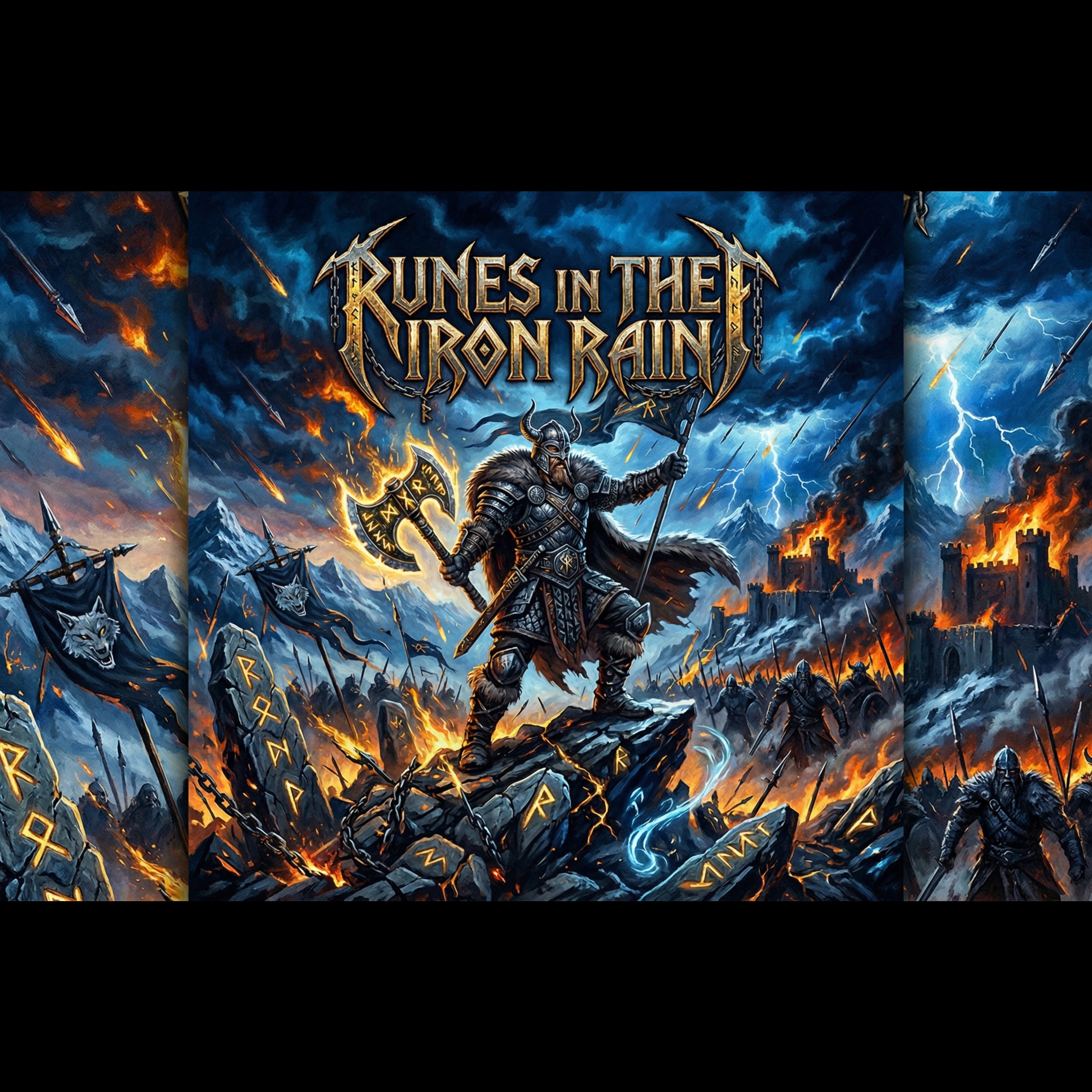 European underground traditional heavy metal, 1990s to now, built from obscure continental steel rather than any one band, Title: Runes in the Iron Rain, Key: C# minor, Tempo: 152 BPM, Use tight 4/4 drums, galloping rhythm guitars, melodic bass that stays audible, twin-lead harmonies, sharp but concise solos, and a clear mix with analog grit, Vocals: forceful male tenor, gritty midrange, high chorus lift, crowd chants, no pop gloss, Mood: epic northern heavy metal; imagery and subtext: runes, iron rain, ancestors, will, Arrangement: short cold intro, riff-heavy verse, rising pre-chorus, huge anthem chorus, second verse with more lead motion, bridge, solo, final double chorus, Direction: Teutonic-Nordic battle metal, Crowd chant: Stormborn beyond embers beyond frozen stars beyond loud glory